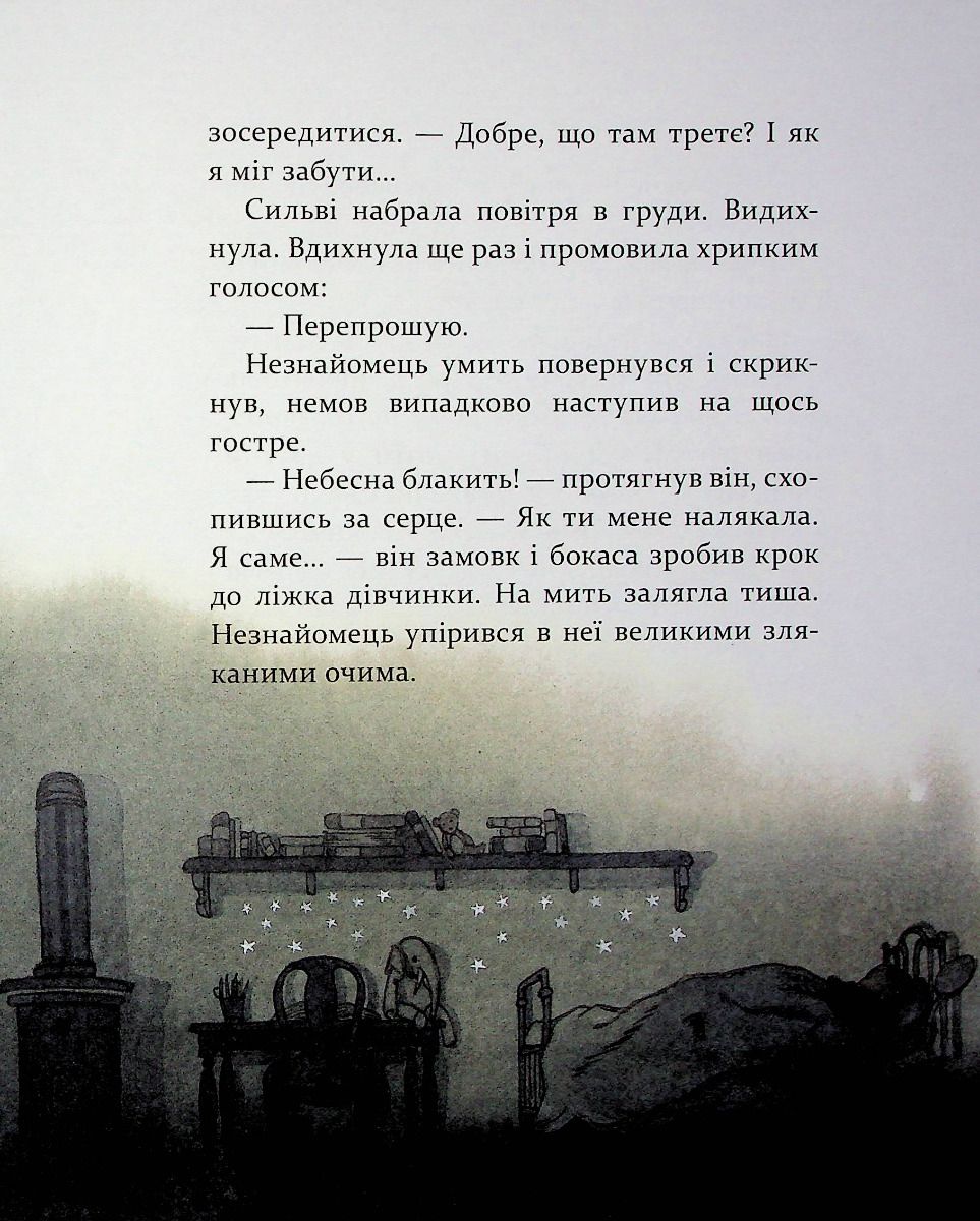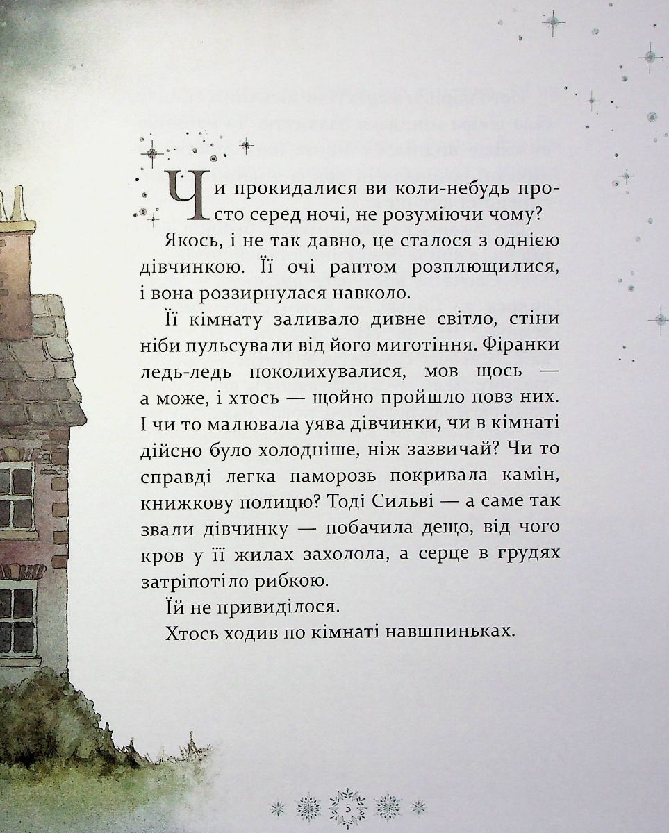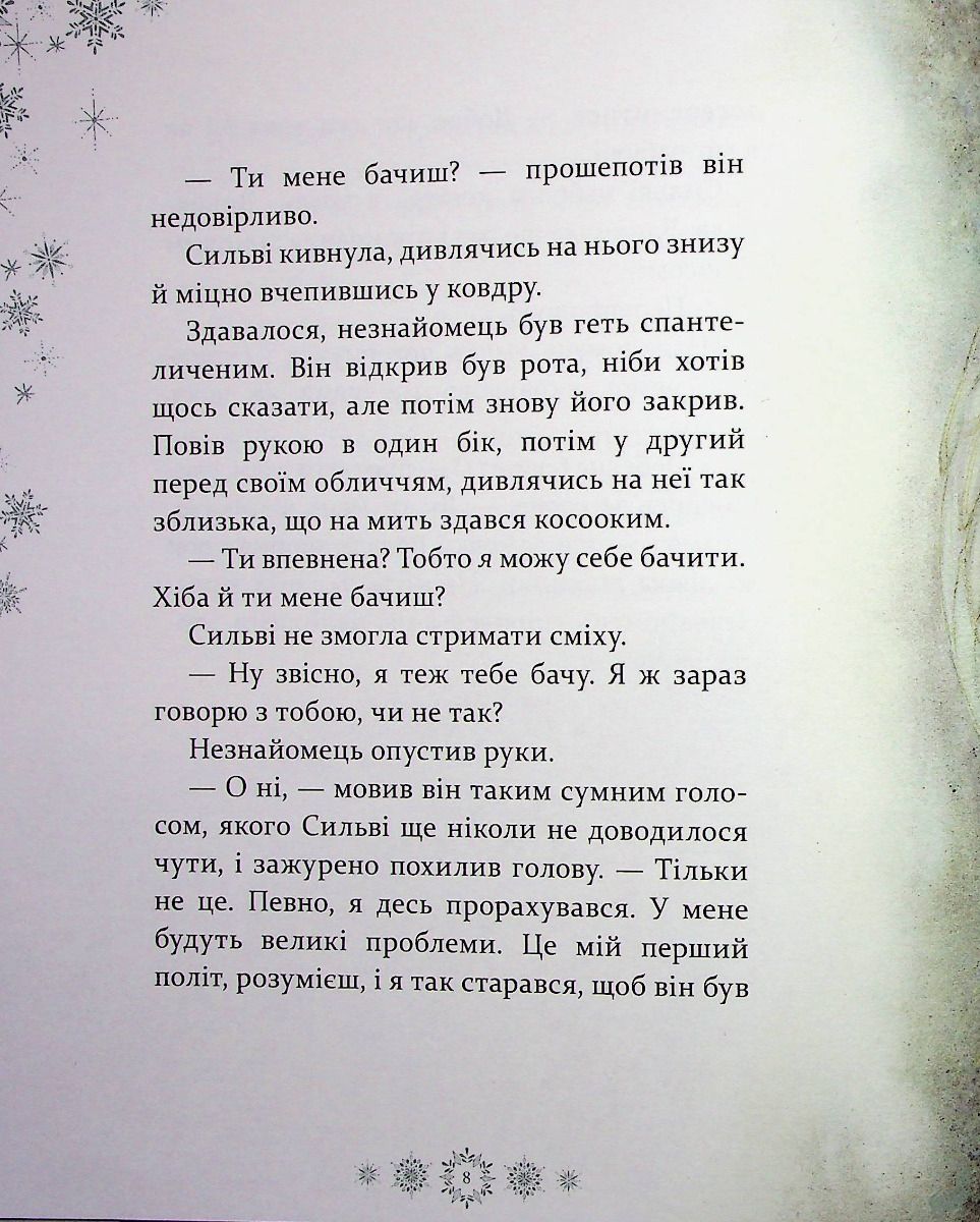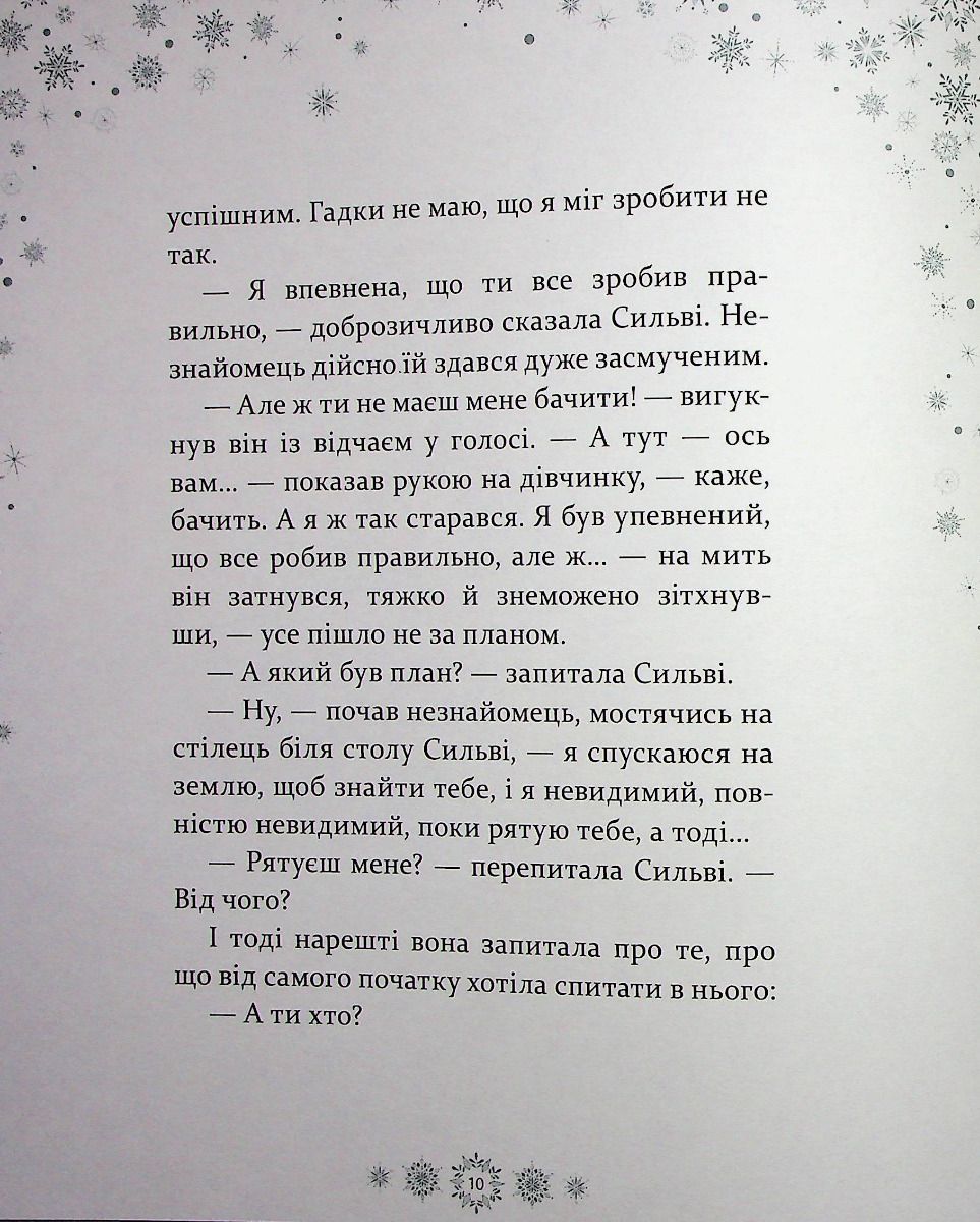 "Тепер Сильві знала напевне, що сніговий янгол був там, із нею, наглядав за нею, увесь цей час, як і обіцяв. Вона не забула його й знала, що він в її пам’яті назавжди. Його не можна було прикликати, наражаючи себе на небезпеку: це так не працює. Він з’являвся лише тоді, коли справді їй був потрібен, хоч вона про це й не думала.