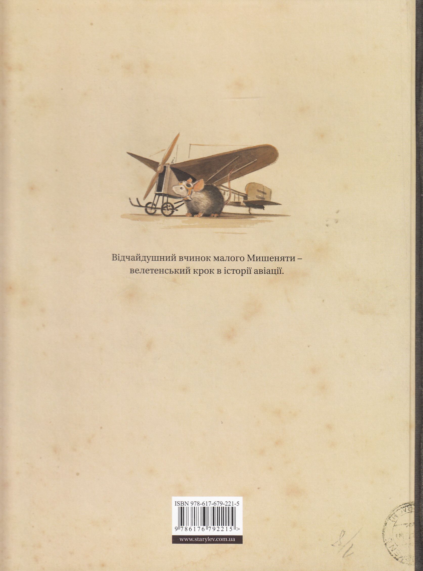 Це захоплива хроніка створення першого «мишоплана». Шлях героя буде непростим: від невдалих спроб змайструвати крила до грандіозного перельоту, який назавжди змінить історію авіації (і мишачої, і людської!).