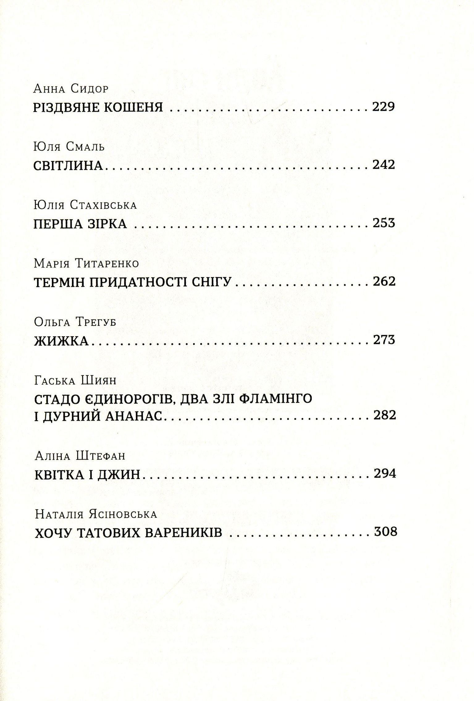 До книги увійшли твори таких авторів: Дорж Бату, Андрій Бачинський, Надя Біла, Ольга Войтенко, Оксана Давидова, Євгенія Завалій, Валентина Захабура, Олена Захарченко, Сашко Кочубей, Березня Ліпша, Оксана Лущевська, Богдана Матіяш, Роман Росіцький, Оля Русіна, Мар''яна Савка, Світова Слава, Ганна Сидор, Юля Смаль, Юлія Стахівська, Марія Титаренко, Ольга Трегуб, Гаська Шиян, Аліна Штефан, Наталія Ясіновська.
