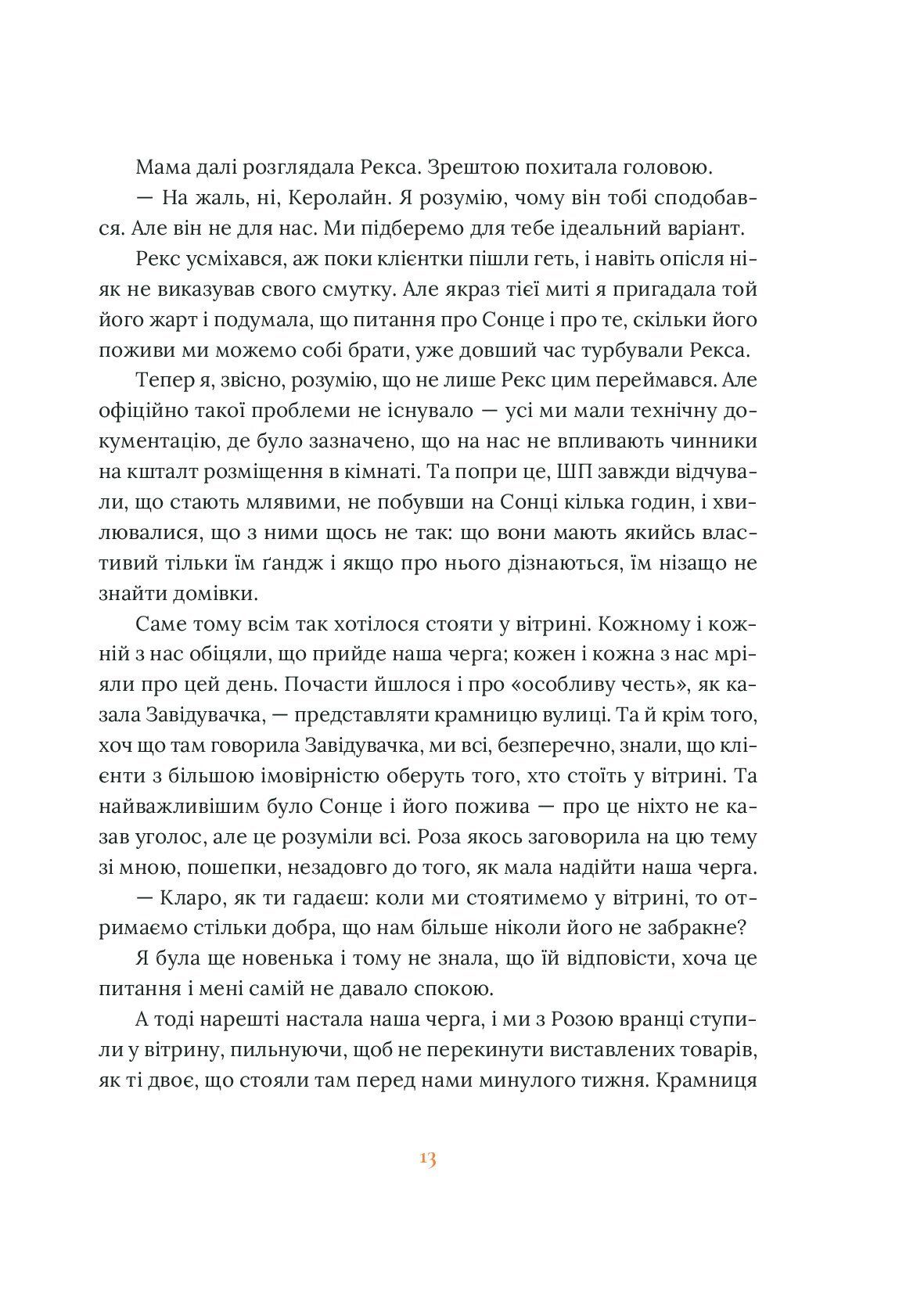 Історію розповідає незвичайна оповідачка — роботка Клара, створена для того, щоб стати вірною подругою дитині, яка обере її у крамниці. Це витончено щемка, але стримана оповідь про життя у світі майбутнього, де технології керують щоденністю, суспільство поділене новими класовими межами, а генетичне редагування стало буденністю.