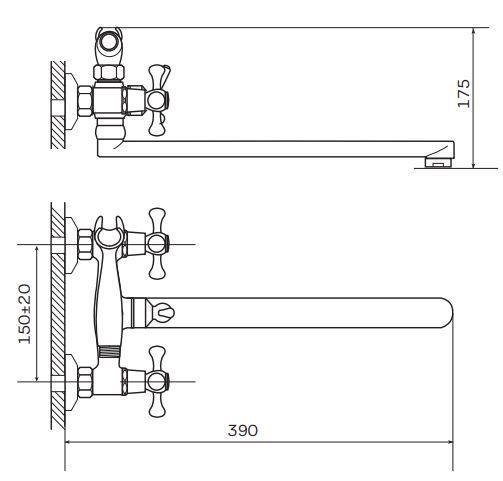 Настінний змішувач для ванної кімнати буксового типу (букса напів-переверт)