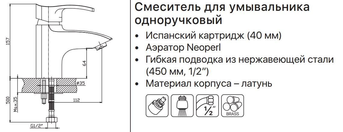 Змішувач для умивальника Haiba Focus з литим нерухомим носом, комплектується гнучкою підведенням 45 див.