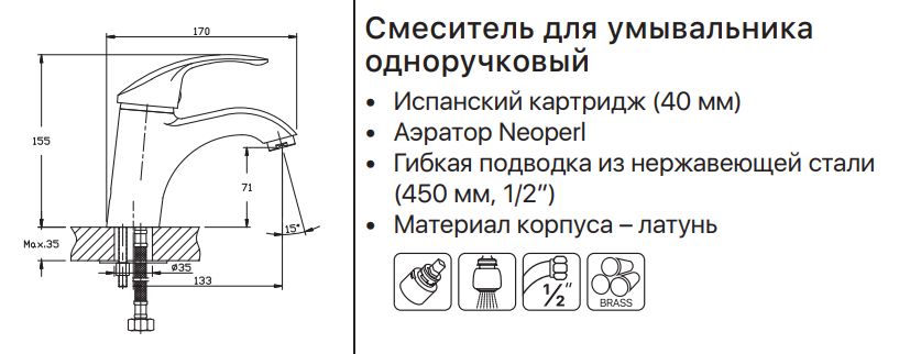 Латунний картріджний змішувач для кухні з високим поворотним носом, комплектується гнучкою підведенням 45 см, кріплення шпилька. Змішувач призначений для вбудованого монтажу на один отвір. Принцип змішування води — одноважільний.
