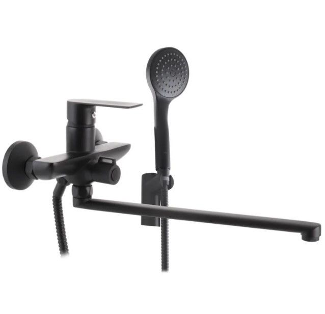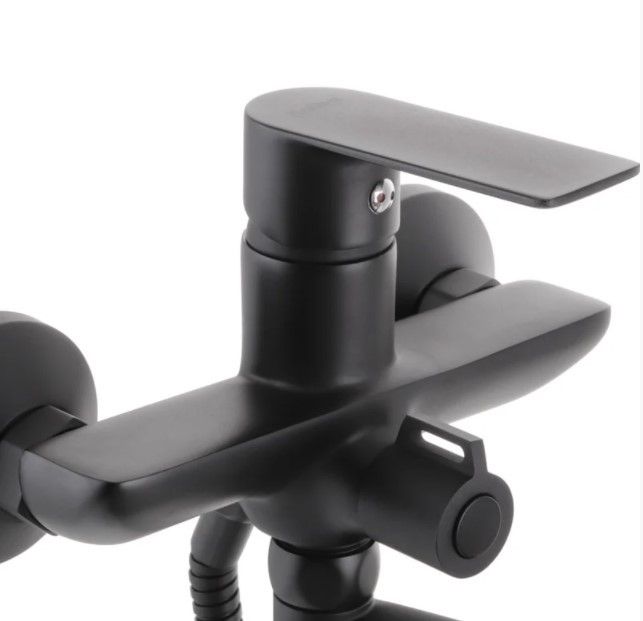 Змішувач для ванни Haiba Alex 006 Euro Black виконаний у чорному матовому кольорі, всі комплектуючі також йдуть у чорному кольорі.