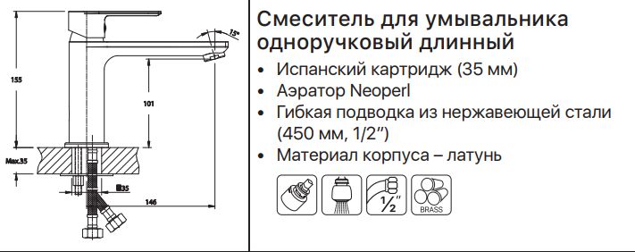 Змішувач для умивальника Haiba Alex 001 Long Чорний виконаний в чорному матовому кольорі з довгим виливом 15 см