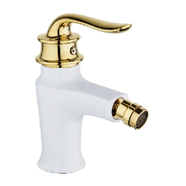 Змішувач для біде в білому кольорі, ручка і аератор виконані з золотим відливом.