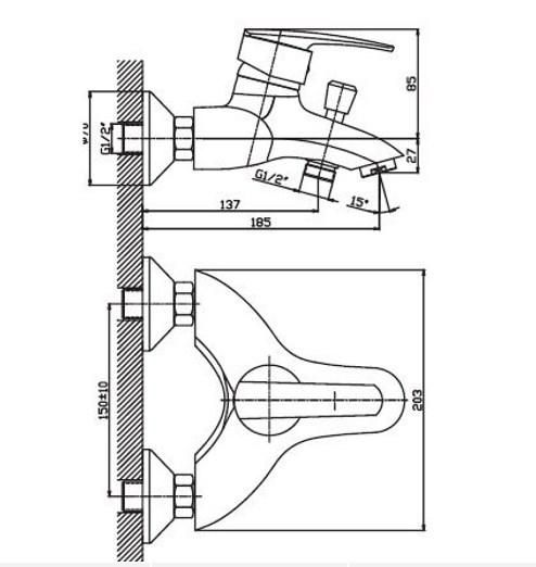Латунний змішувач для ванни Haiba Agat 009 з коротким литим нерухомим виливом. Змішувач призначений для настінного монтажу на два отвори. Принцип змішування води — одноважільний. Оснащений вбудованим перемикачем на душ та душовим комплектом.