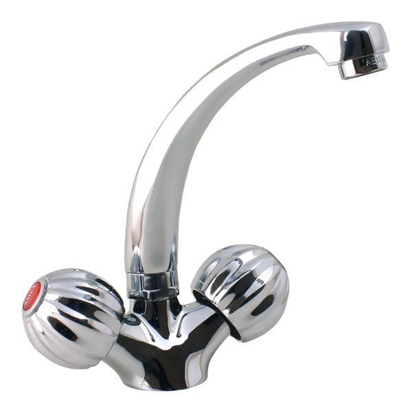 Латунний вентильний (кран-буксовий) змішувач з поворотним високим носом, комплектується гнучкою підводкою 45 см. Змішувач призначений для монтажу на один отвір, кріпиться до мийки двома шпильками.