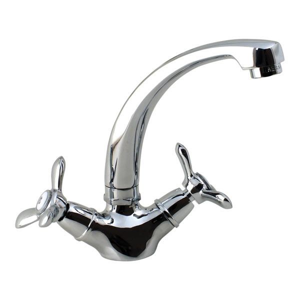 Латунний вентильний (кран-буксовий) змішувач з поворотним високим носом, комплектується гнучкою підведенням 45 див. Змішувач призначений для монтажу на один отвір, кріпиться до мийки двома шпигами