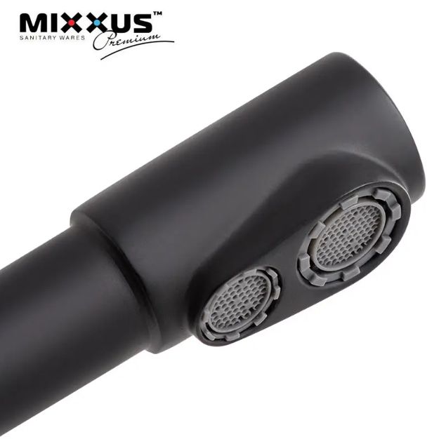 Стильний дизайн. Модель має матове покриття з емалі у насиченому класичному кольорі. Чорний змішувач Mixxus виглядає солідно та сучасно.