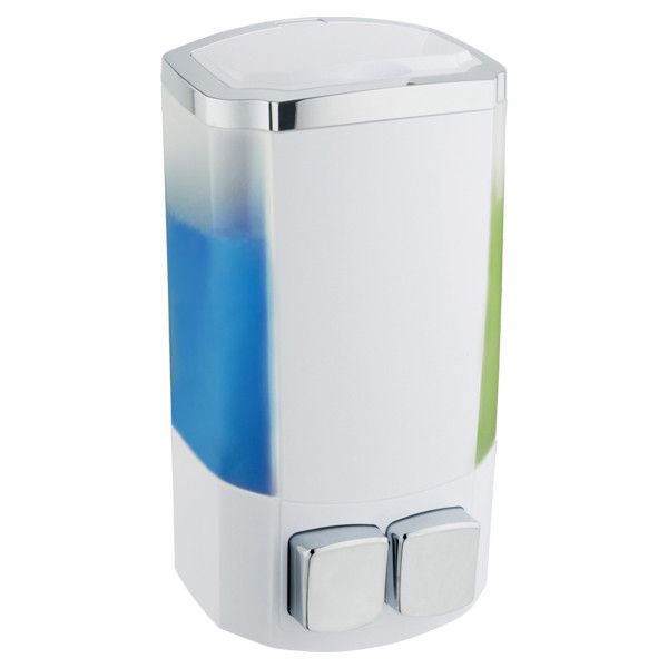 Дозатор для рідких миючих засобів. Пластиковий білий корпус, об'єм 2 по 250 мл, монтаж настінний