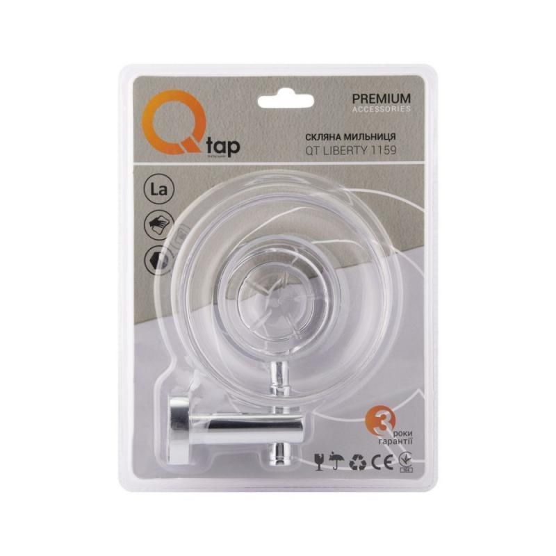 Мильниця Qtap Liberty CRM 1159 міцно кріпиться до стіни, включає утримувач і скляну чашу. Виріб не піддається корозії. Мильниця знімна, завдяки чому догляд за нею буде простим і легким. У виробі використовується ущільнювальне кільце (прокладка), необхідне для щільного з'єднання металу і скла, також перешкоджають виникненню шуму в результаті зіткнення частин виробу. На тримач завдано фірмовий логотип компанії.