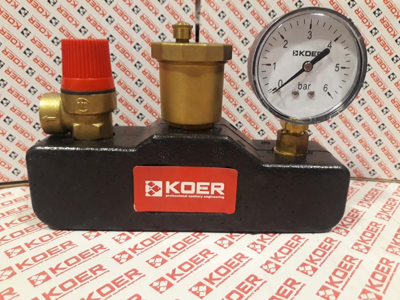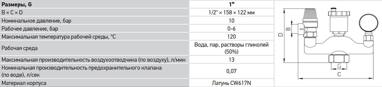 Комплектна група безпеки для оснащення котлів і бойлерів систем автономного опалення, ГВП. Застосовується в установках з тепловою потужністю до 44 кВт (визначається штатним запобіжним клапаном). Допустима робоча середовище – пар, вода, незамерзаючий теплоносій (максимальний вміст гліколів – 50 %). Склад виробу: запобіжний клапан, автоматичний повітровідвідник, манометр, латунний корпус. Група безпеки котла монтується на виході з теплогенератора