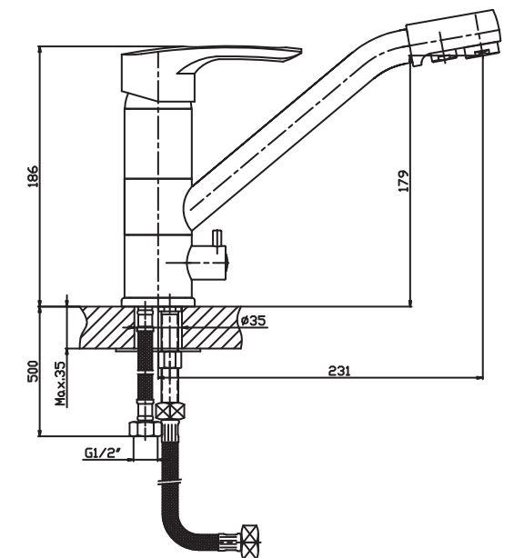 - Гнучке підведення з нержавіючої сталі (450 мм, 1/2”).