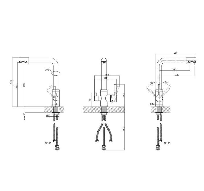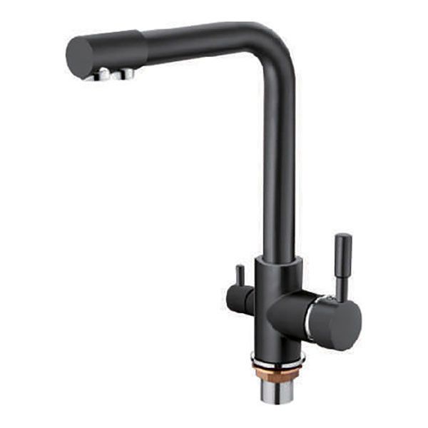Змішувач для кухні з підключенням до фільтра Zerix LR4055B-3 з високим, поворотним гусаком на 360 градусів і кріпленням на гайці призначено для приєднання до водопровідної та фільтрованої води. Один важіль змішує холодну і гарячу воду, а ручки з іншого боку — фільтровану воду. Змішувач виготовлений з латуни високої якості і оснащений керамічним картриджем (F 35), у комплекті три гнучких шланги для підводу гарячої, холодної і фільтрованої води. Гарантія на змішуватель від заводу виробника 24 місяці з моменту встановлення.