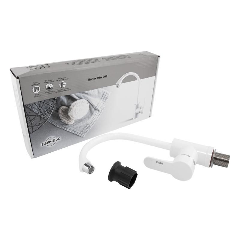 Змішувач для кухні Brinex 40W 007 виготовлений з ABS пластику. Має одноважільне управління, яке регулює напір холодної і гарячої води. Виконаний в сучасному, стриманому стилі з білою глянсовою поверхнею. Такий змішувач можна назвати універсальним, він буде ідеально виглядати в будь-якому інтер'єрі кухні.