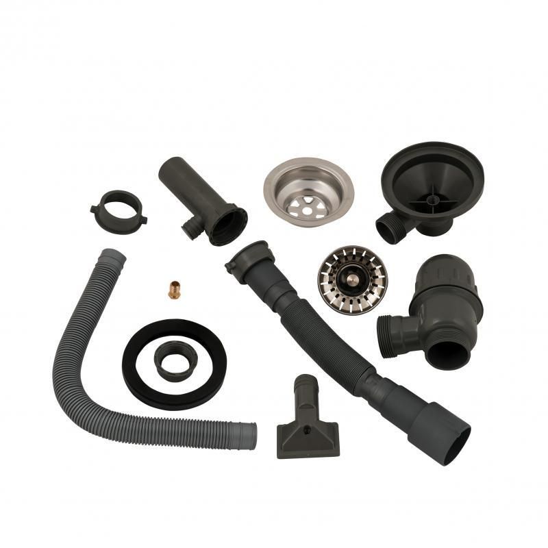 Сифон для кухонного мийки Lidz (GRA) 47 01 002 01 виготовлений із пластику сірого кольору у вигляді склянки - колби з металевими ґратами та гофрованих труб. Резервуар сифона відкручується для чищення. Гофрований вихід дає можливість змінювати довжину та кут труби. Завдяки комунікації для переливу можна уникнути переповнення кухонної раковини водою.