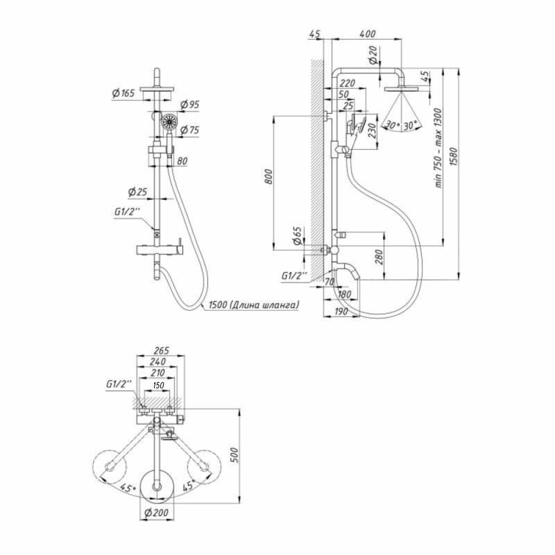 Діаметр лійки, ммРучний душ: 95. Верхній душ: 200