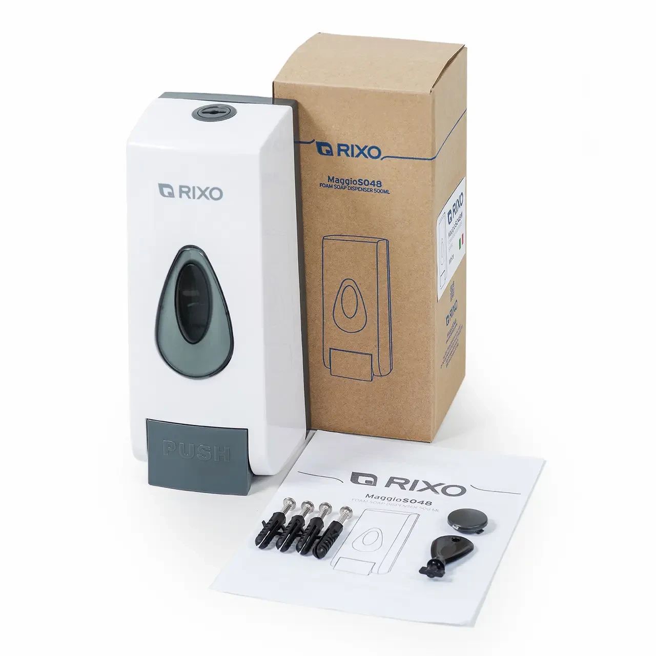 Дозатор мила-піни Rixo Maggio S048W. Унікальність дозатора в тому, що він оснащений вбудованою системою приготування мила-піни. Система подачі здатна перетворювати мило-піну з рідкого мила і води (у відсотковому співвідношенні відповідно 30/70). Це дозволяє споживачеві в значній мірі економити на витратних матеріалах. Але при цьому, споживач, в якості витратного матеріалу також може використовувати і готове мило-піну. Дозатор виконаний з ударостійкого пластику ABS . Велике оглядове вікно дозволяє контролювати рівень мила в дозаторі. Простий в експлуатації і обслуговуванні. Надійна система подачі виключає протікання.