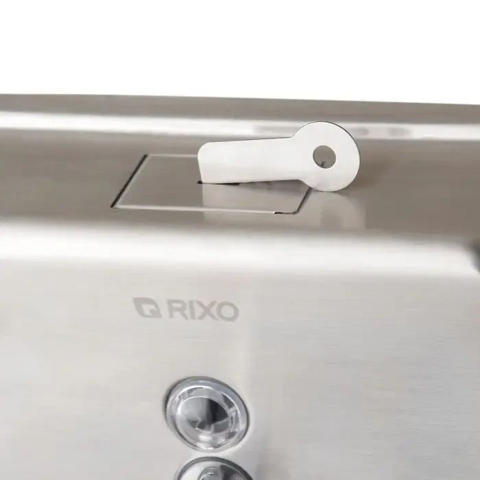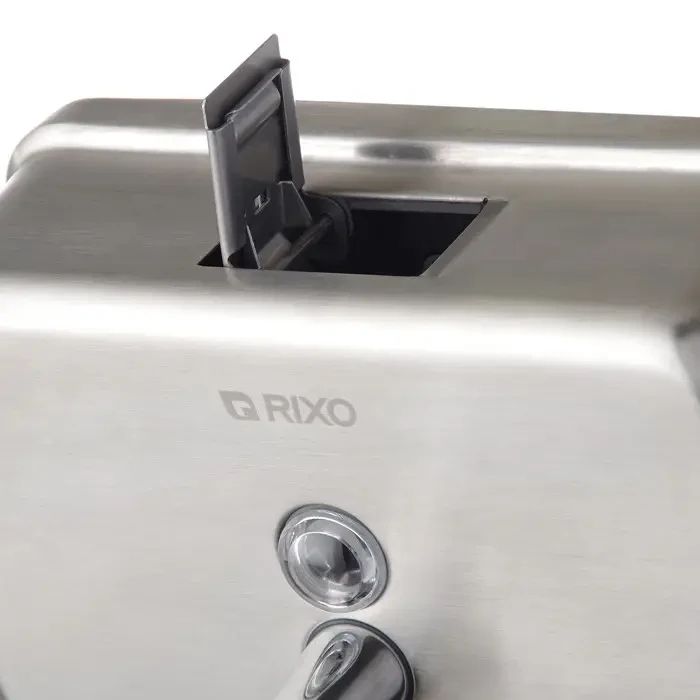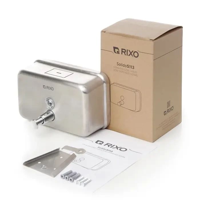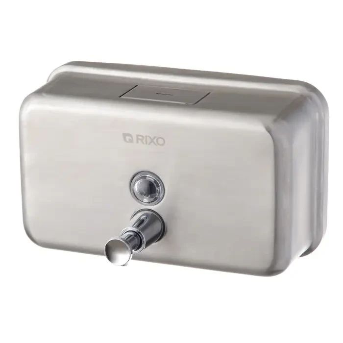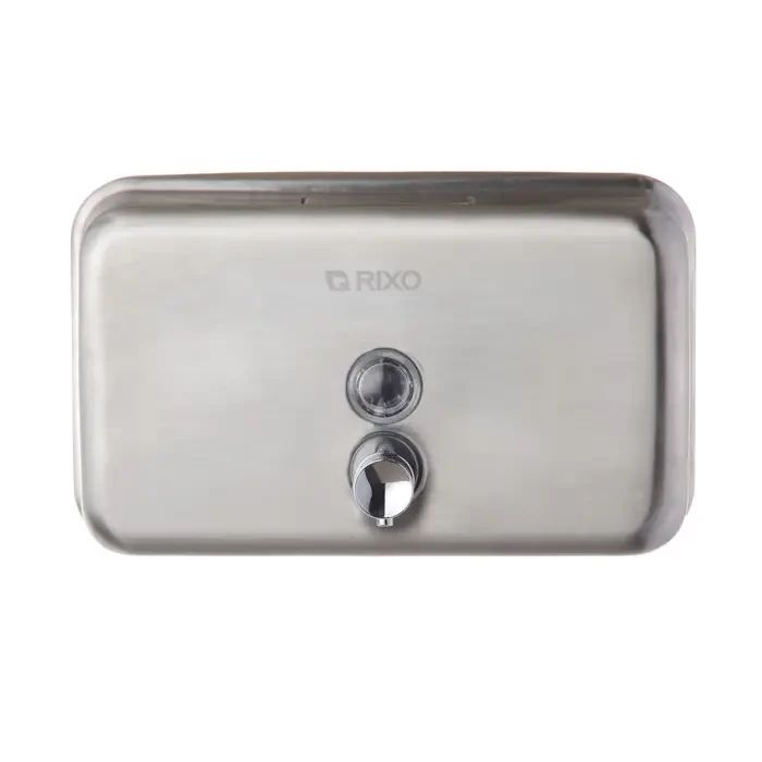 Горизонтальний дозатор рідкого мила з нержавіючої сталі RixoSolidoS113. Дозатор виготовлений із високоякісної нержавіючої сталі AISI 304, яка забезпечить тривалий термін служби та може використовуватись протягом багатьох років. Кнопка з клапаном дозволяє швидко і легко дозувати мило, а прозоре віконце на передній панелі дозволяє легко при необхідності стежити за кількістю мила, щоб його можна було вчасно поповнити. Дозатор закривається на ключ, що унеможливлює потрапляння сторонніх предметів у ємність. Сталевий корпус надає йому антивандальні властивості, дозатору дуже важко завдати механічних та термічних пошкоджень.