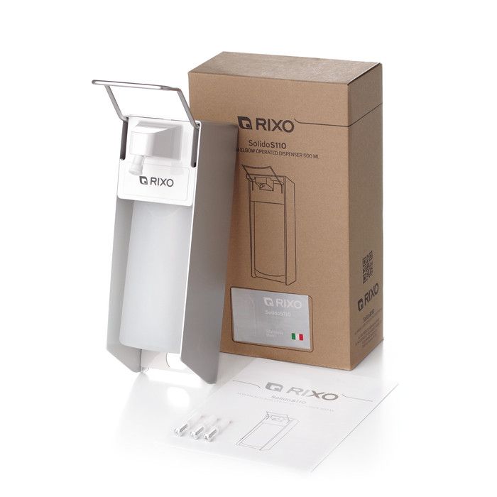 Настінний ліктьовий дозатор Rixo Solido S110 використовується в місцях із підвищеними вимогами до гігієни. Підходить для використання в лікарнях, кафе та ресторанах, школах та ін., рекомендується до оснащення місць із серйозними вимогами до чистоти та гігієни. Корпус дозатора виконаний з міцного алюмінію, важіль з нержавіючої сталі, насос, що дозує, виготовлений з хімічно стійкого пластику. Механізм роботи виключає контакт долоні з поверхнею дозатора, що забезпечує повну гігієнічність. Подача рідини здійснюється легким натисканням ліктя на важіль, диспенсер не допускає протікання миючого засобу. Завдяки знімному носику-розпилювачу, дозатор може працювати з рідинами будь-якої в'язкості та рідких засобів для дезінфекції рук. Під дозатором для видалення ємності має бути вільний простір не менше 15 см, над дозатором не менше 10 см для зняття його зі стіни.