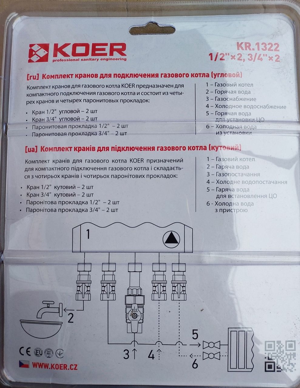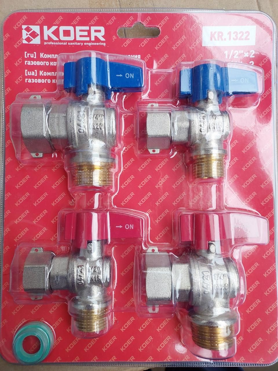 Комплект кранів Koer KR.1322 для під'єднання газового котла кутовий (1/2"x2шт, 3/4x2шт) призначений для компактного під'єднання газового котла та складається з чотирьох кранів і чотирьох паронітових прокладок