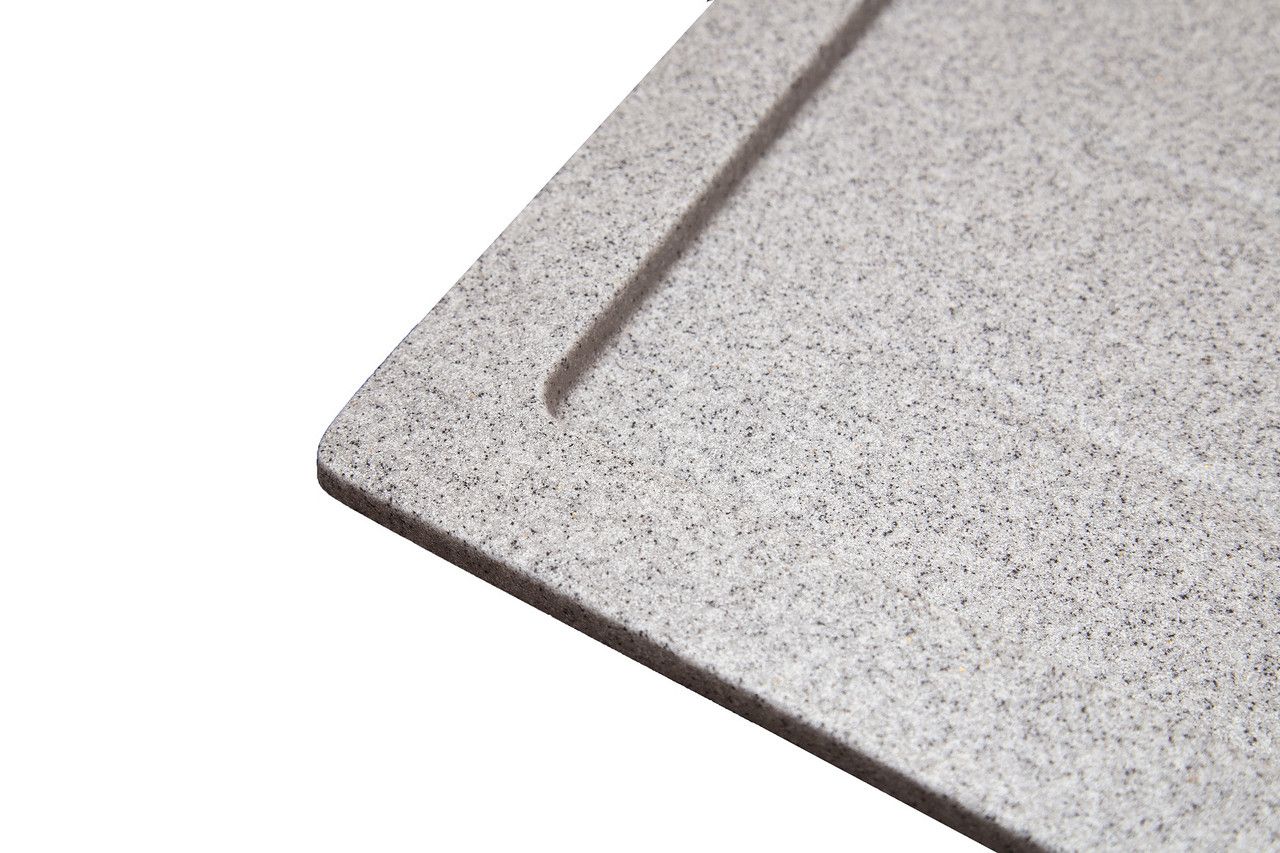 У процесі виробництва мийок Romzha концентрація кварцу на поверхні раковин збільшується, а акрилова смола зменшується. Завдяки цьому всі корисні властивості граніту - а саме стійкість до подряпин і плям - виражаються на передній частині раковини. Саме там, де це потрібно