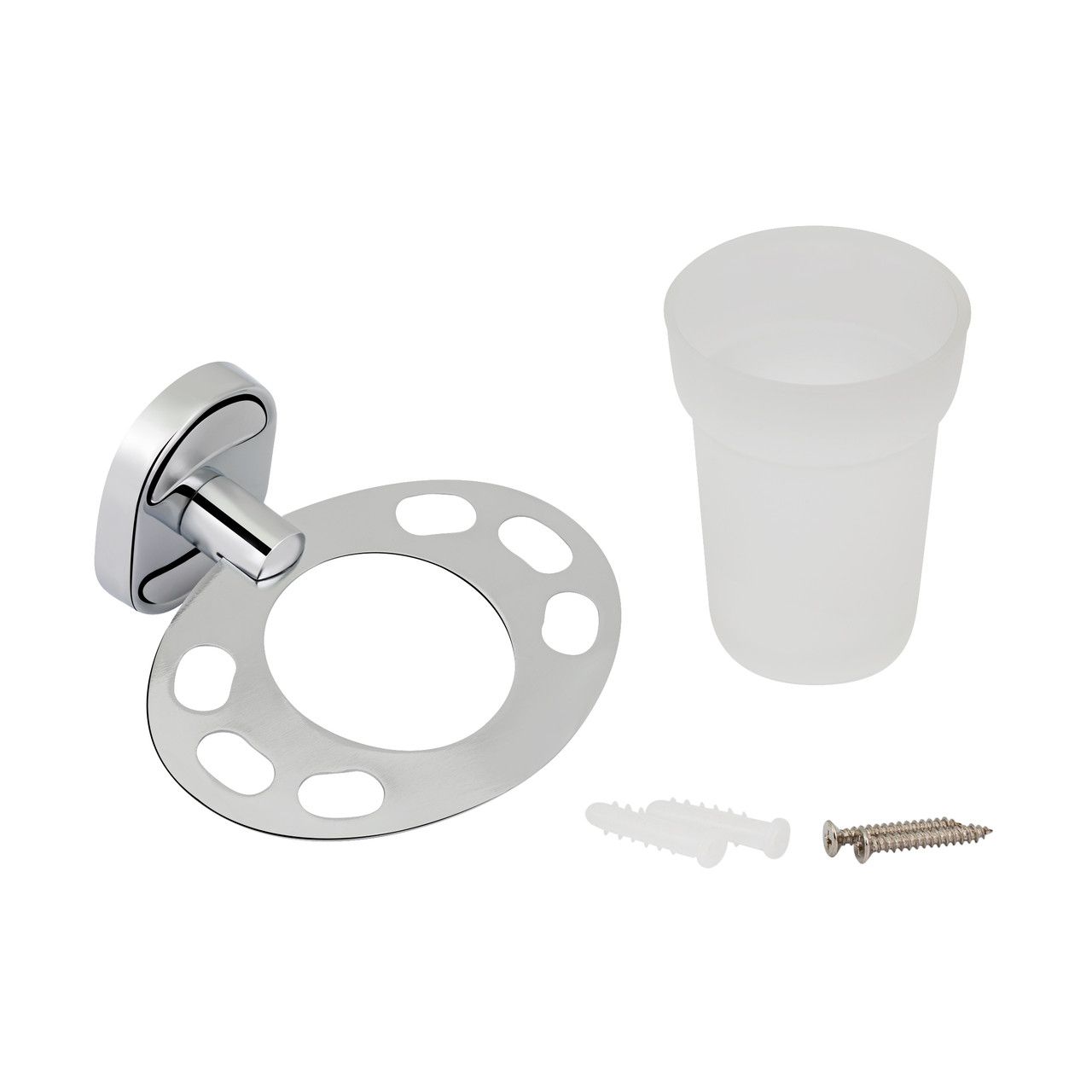 Настінний стакан Kroner KRM Elbe-ACG2906-1 для ванної кімнати складається зі скляної матової склянки та металевого тримача. Діаметр склянки 61 мм, кріпиться на стіні на потрібній висоті, він знімний і легко миється. Поверхня навколо склянки має отвори для зубних щіток. Приховане кріплення дає змогу зберегти обробку, а хромоване покриття запобіжить утворенню корозії й бруду.