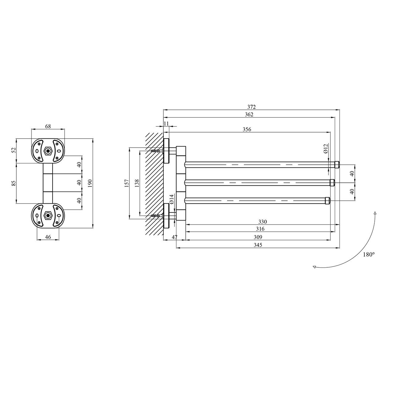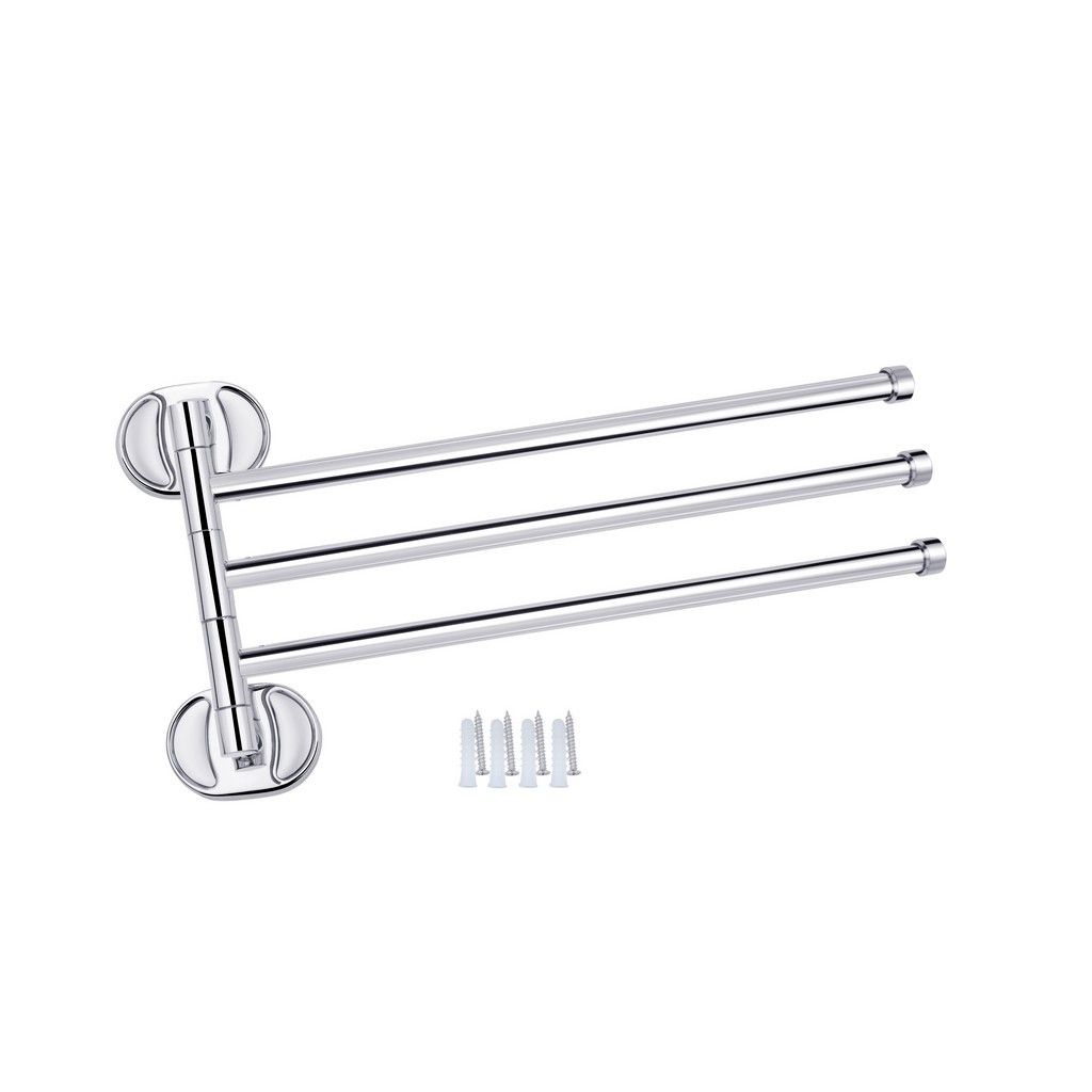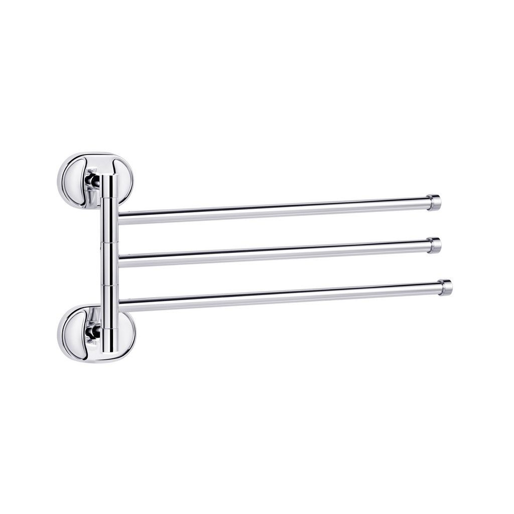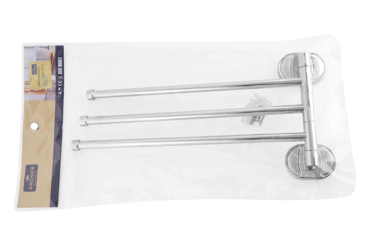 Потрійний тримач для рушників Kroner KRM Elbe-ACC2913 стане оригінальним доповненням ванної кімнати. Тримач для рушників виготовлений із міцного металу з хромованою поверхнею й має три поворотні стрижні, на які можна розмістити рушники. Довжина виробу 372 мм. Крім того, виріб обладнаний поворотним механізмом для повороту стрижнів у необхідному напрямку. Приховане кріплення дає змогу зберегти обробку, а хромоване покриття запобіжить утворенню корозії й бруду. Тримач для рушників кріпиться на стіні на бажаній висоті.
