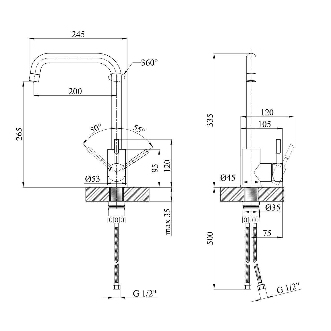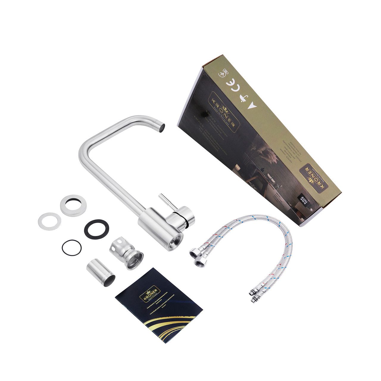 Кухонні змішувачі від KRONER — це німецька якість, технологія та надійність. Сучасний дизайн стане вдалим доповненням інтер'єру кухні. Виготовлення з якісних матеріалів, що не піддаються корозії, легкість у складанні не створить клопоту під час монтажу та використання. Мають поворотне злиття та встановлюють на один отвір із підведенням води за допомогою гнучких шлангів М10х1/2". Шланги для під'єднання входять до комплекту. Ця модель виготовлена з неіржавкої сталі AISI 304.