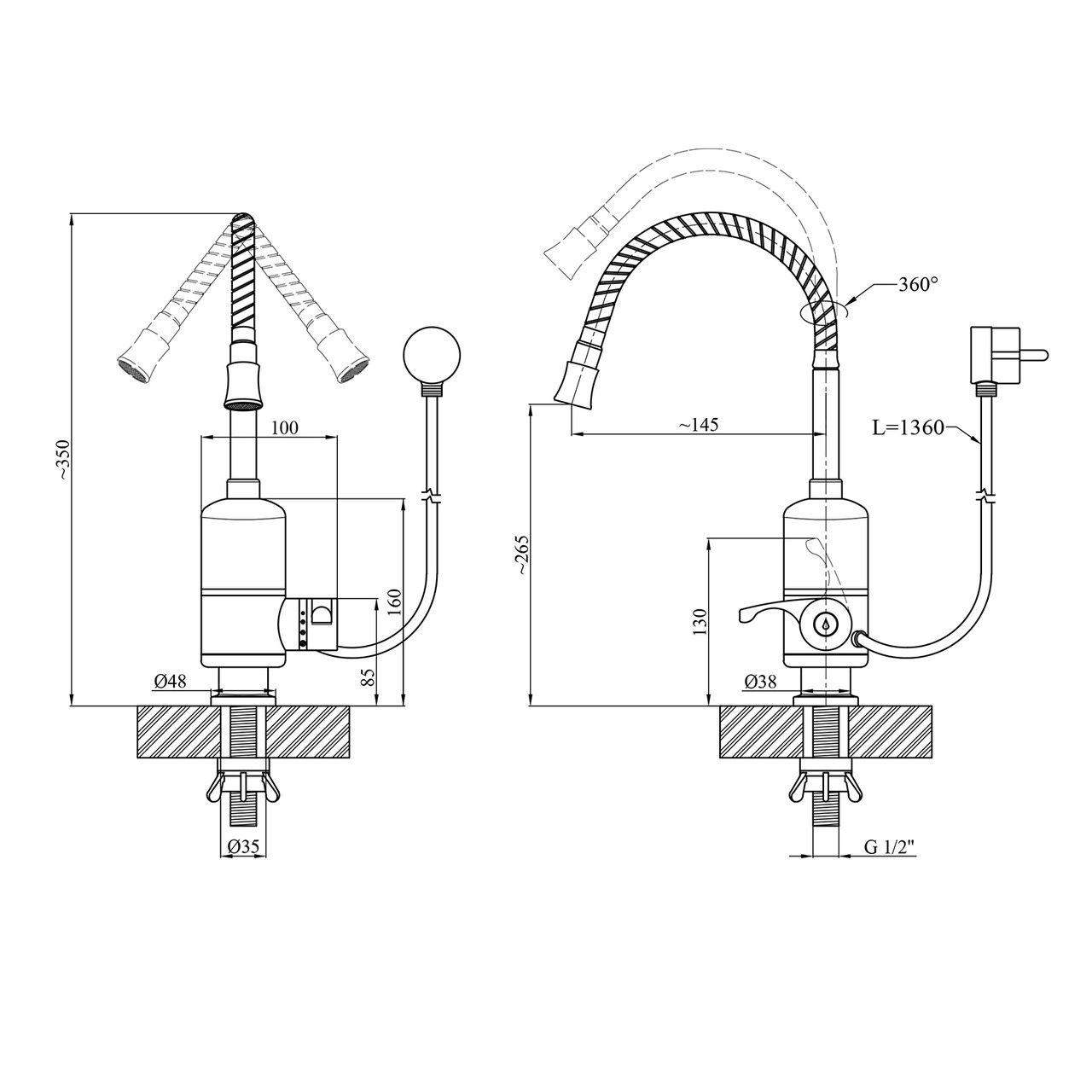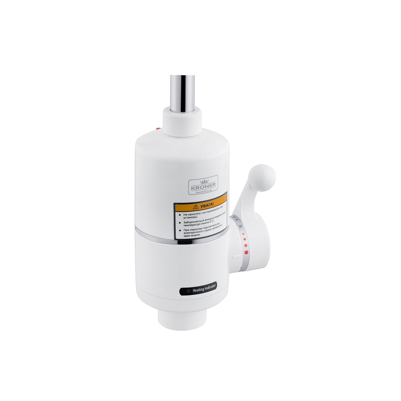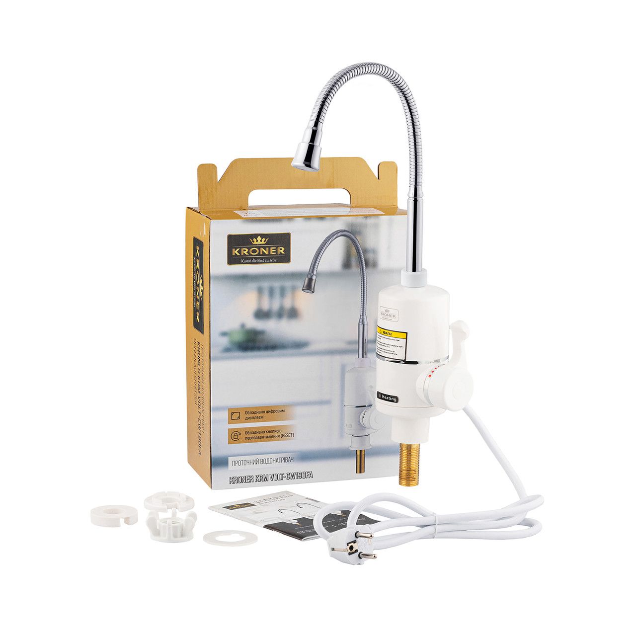 Проточний водонагрівач Kroner Volt-CW190RFA замінює звичайний змішувач і водонагрівач, забезпечуючи постійне нагрівання води в одній точці. Використання Kroner KRM Volt-CW190RFA заощаджує корисні місця на кухні та кошти на купівлю додаткового обладнання. Гнучкий вилив обертається на 360° і в такий спосіб дає змогу налаштовувати напрямок потоку води. Нагрівання води здійснюється завдяки ТЕНа з неіржавкої сталі потужністю 3000 Вт, яка миттєво нагріває воду, що проходить через нього. Встановлення та під'єднання водонагрівачів не вимагає спеціальних навичок і обладнання — монтаж можна самостійно, все необхідне для під'єднання вже є в комплекті.