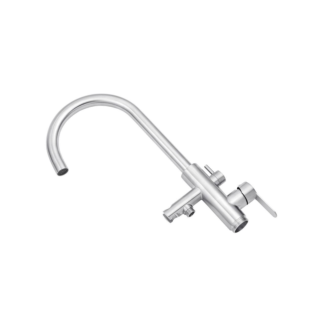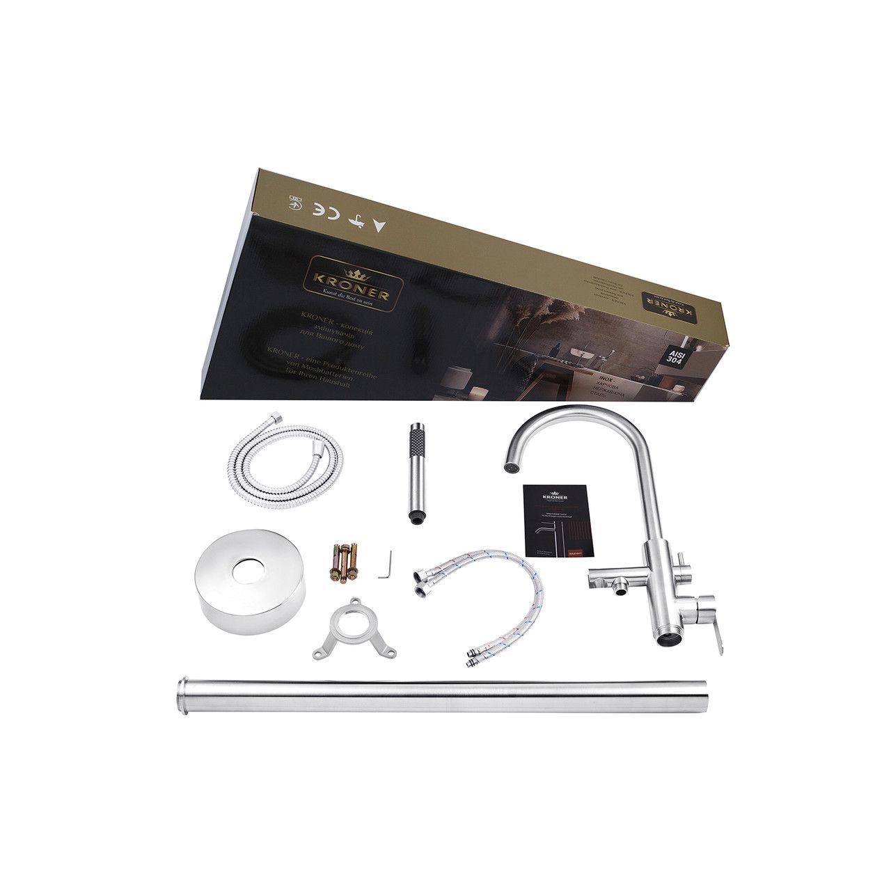 Змішувач окремішній для ванни Kroner KRP Edelstahl Klassisch-ESG077 створений з урахуванням зовнішнього вигляду та функціональності, є альтернативою класичним змішувачам для ванної кімнати. Виготовлений із харчової неіржавкої сталі SUS 304, що забезпечує довговічність і безпеку в експлуатації виробу. Змішувач обладнаний керамічним картриджем діаметром 35 мм, що забезпечує плавне регулювання температури та напору за допомогою важеля. Обладнаний перемикачем ванна/душ, відводом для приєднання душового шланга діаметром ом 1/2". Монтується на один отвір за допомогою гнучких підводок під'єднанням 1/2".