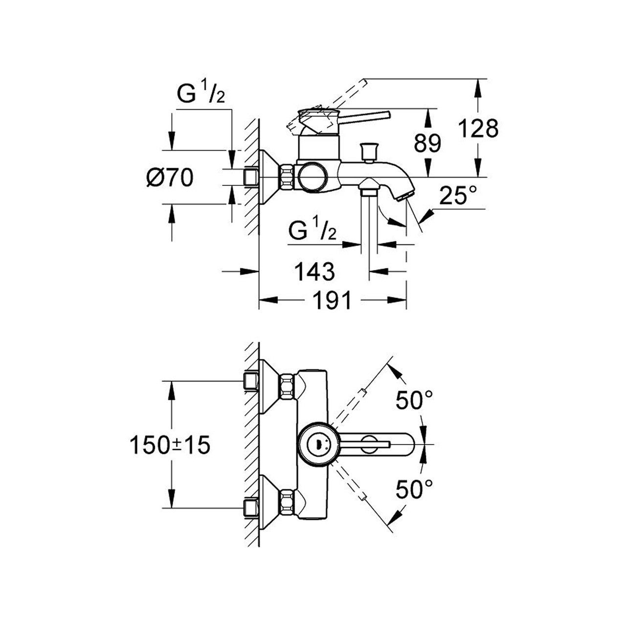Цей змішувач для ванни має зовнішній монтаж і підходить для встановлення на стіну. Він обладнаний двома отворами для монтажу та має технологію GROHE QuickFix Plus, що спрощує процес встановлення. Рекомендований мінімальний тиск для роботи змішувача становить 1 бар.