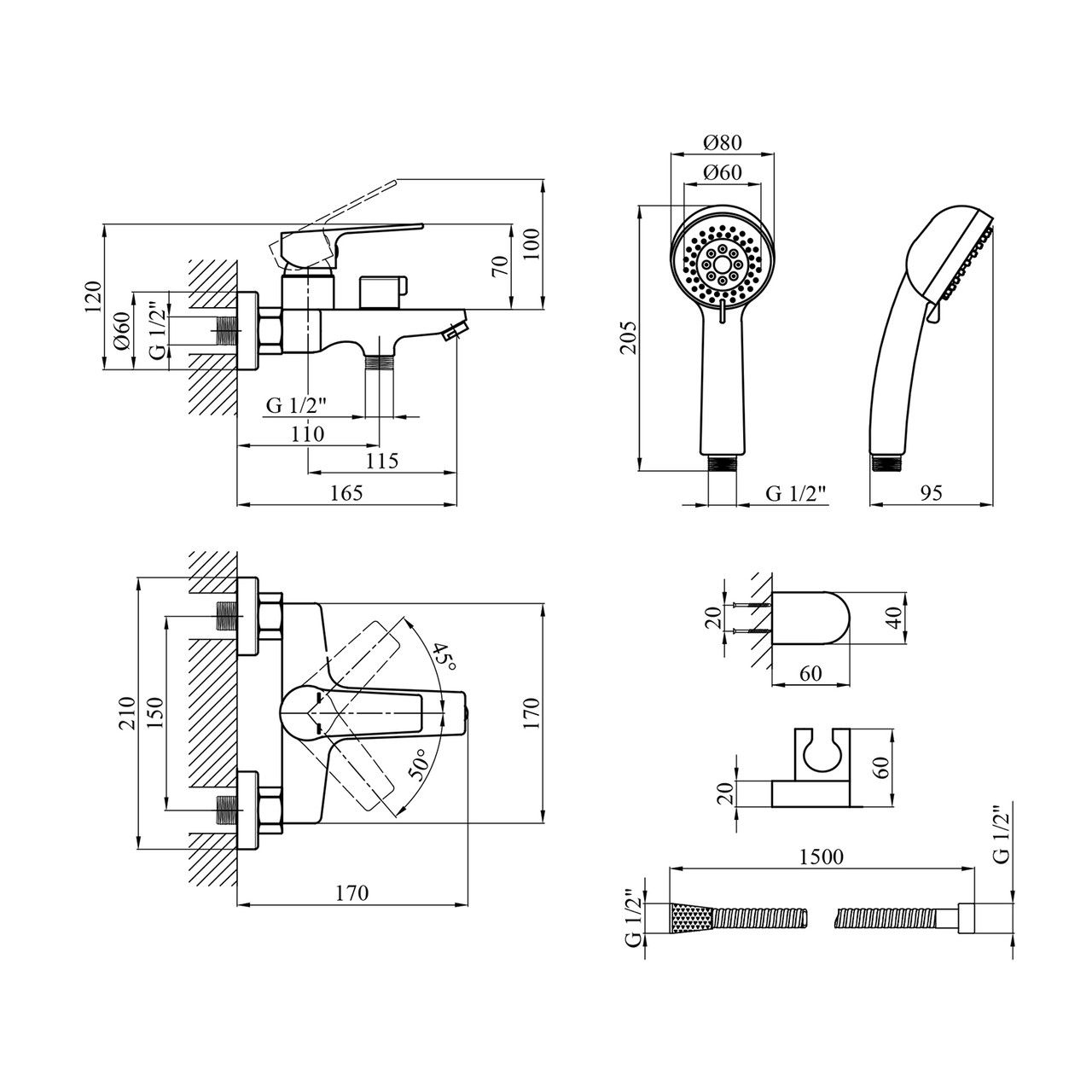 Габарити: Довжина виливу становить 110 мм, а душового шланга — 1500 мм, що забезпечує зручність використання та монтажу.