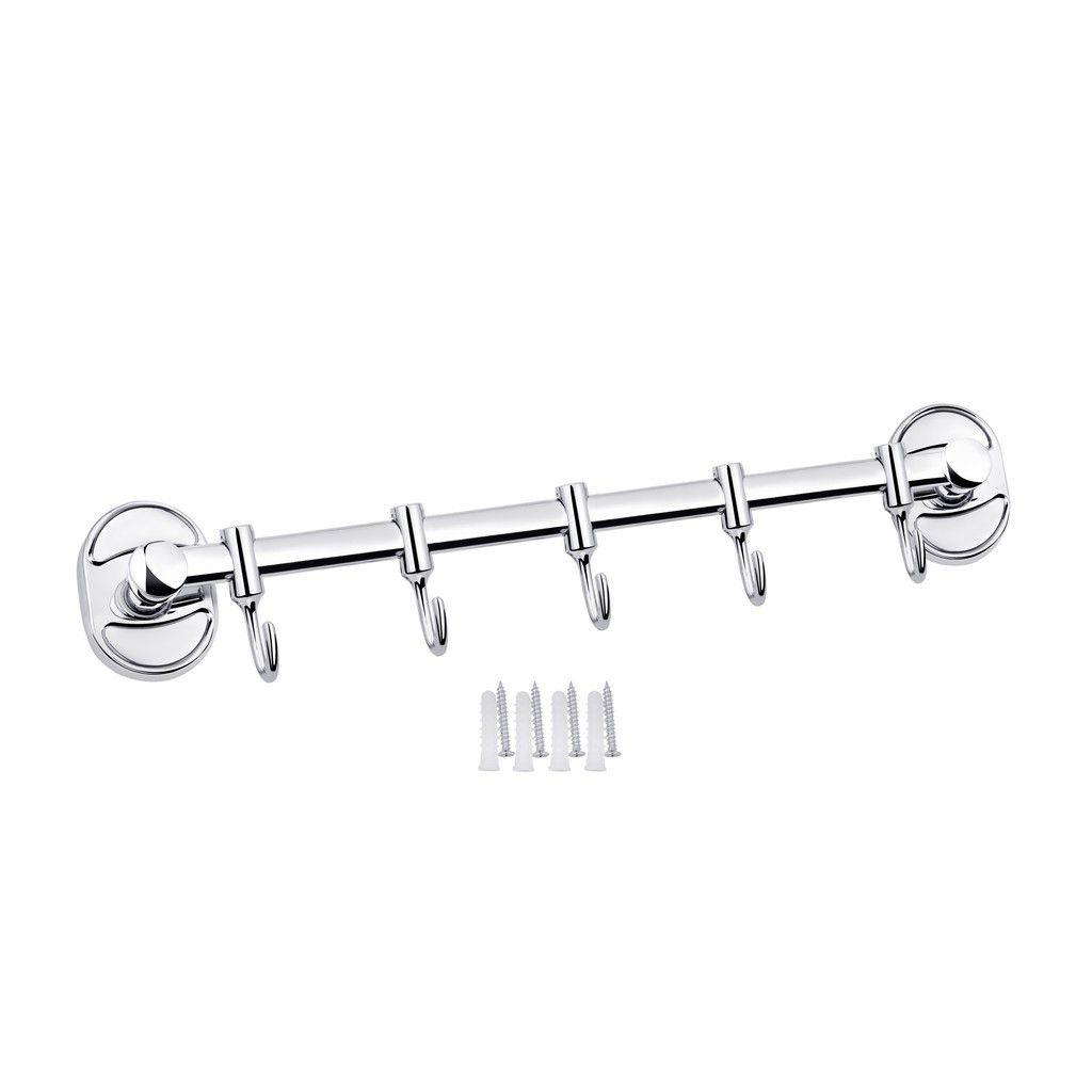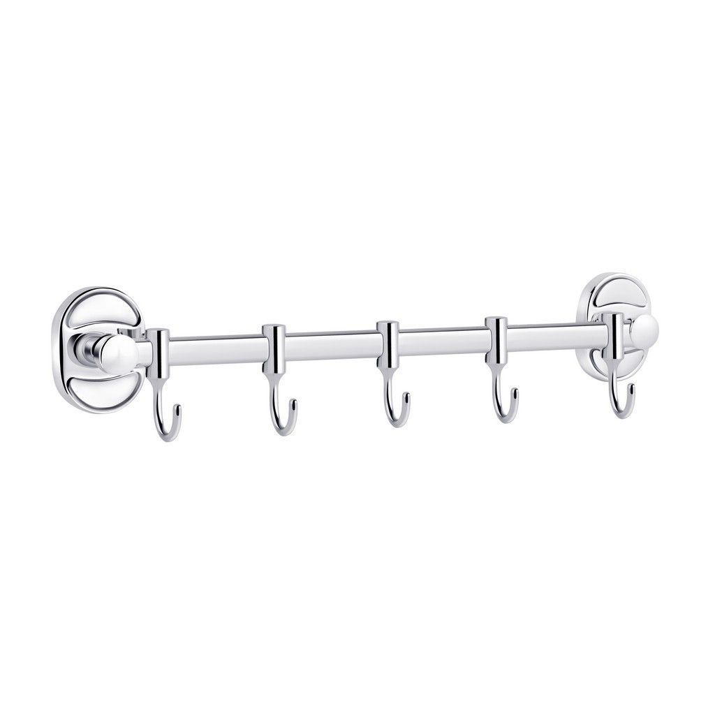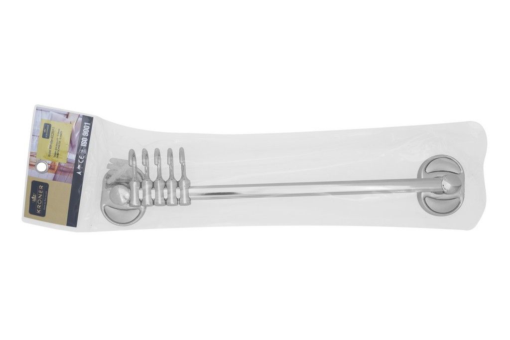 Тримач для рушників і халатів Kroner KRM Elbe-ACC2914-5 зроблений у формі стрижня з п'ятьма пересувними гачками на ньому. Тримач для рушників виготовлений із міцного металу з хромованою поверхнею. Приховане кріплення дає змогу зберегти обробку, а хромоване покриття запобіжить утворенню корозії й бруду. Тримач для рушників кріпиться на стіні на бажаній висоті.