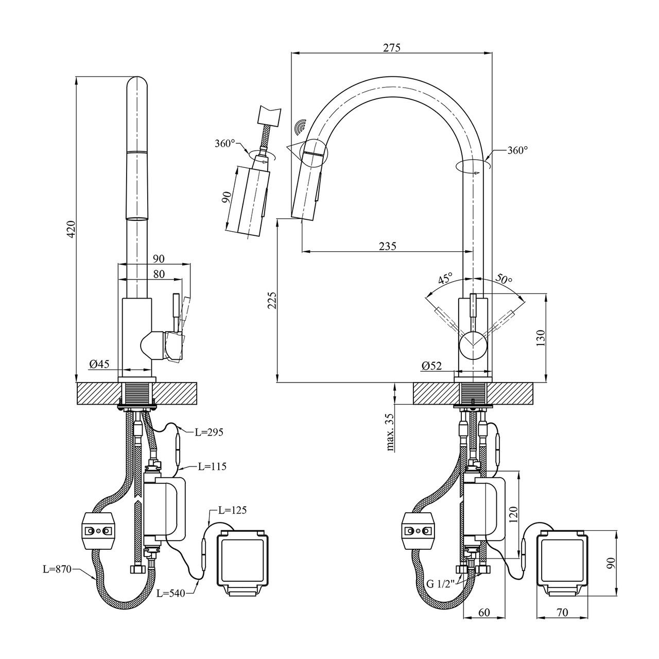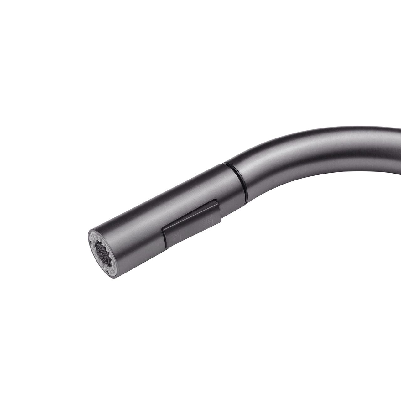 Змішувач має лаконічний дизайн і високу функціональність. Висувна лійка забезпечена шарніром, що забезпечує обертання на 360 градусів. Два режими розпилення — від потокового струменя без бризок до потужного струменя душу — дають змогу ефективно виконувати різні завдання, як-от ополіскування посуду або видалення забруднень.