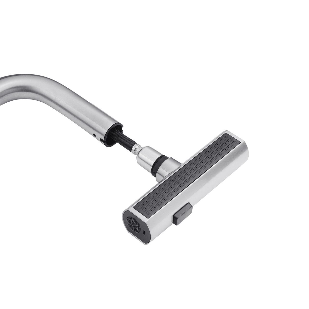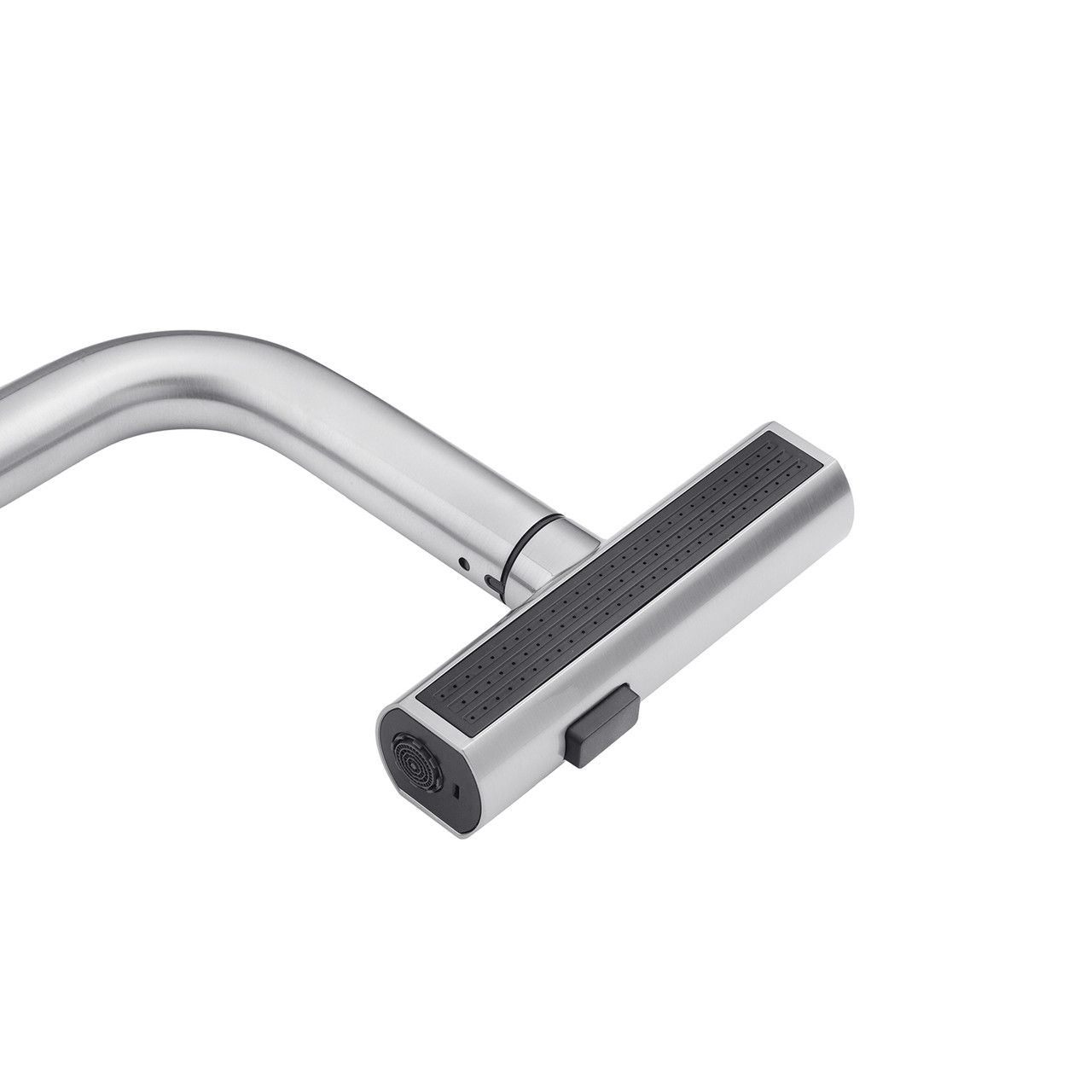 Він пропонує три режими подавання води, придуманих для різних завдань. Режим "водоспад" забезпечує м'який потік води, ідеальний для миття фруктів та овочів. Режим "потоок" підходить для щоденного прибирання та миття рук, забезпечуючи рівномірний потік води. Режим "розпилення" пропонує високий і потужний тиск води для швидкого видалення мийного засобу або забруднень. Перемикання між цими режимами відбувається зручним способом: для режиму розпилення досить затиснути кнопку на лійці, а для режиму "водоспад" — повернути лійку на 90 градусів.