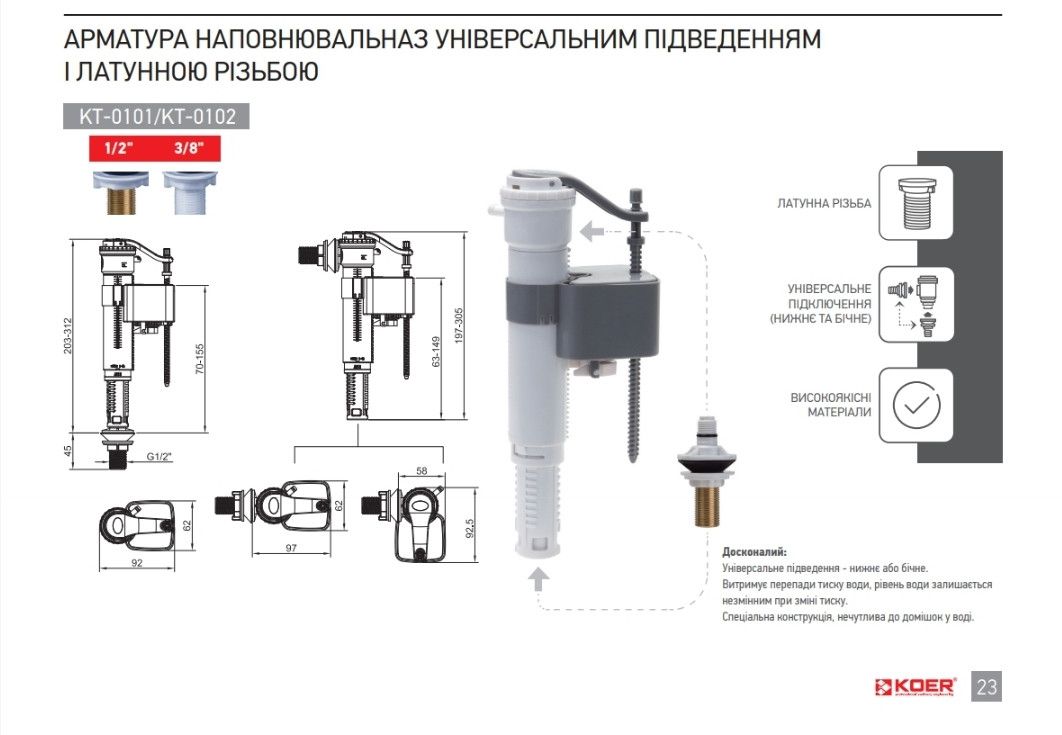 ОСНОВНІ ХАРАКЕТРИСТИКИ ТА ПЕРЕВАГИ КЛАПАНА ДЛЯ БАЧКА УНІТАЗА КТ-0101 УНІВЕРСАЛ 1/2", ПІДВІД НИЖНИЙ, БІЧНИЙ