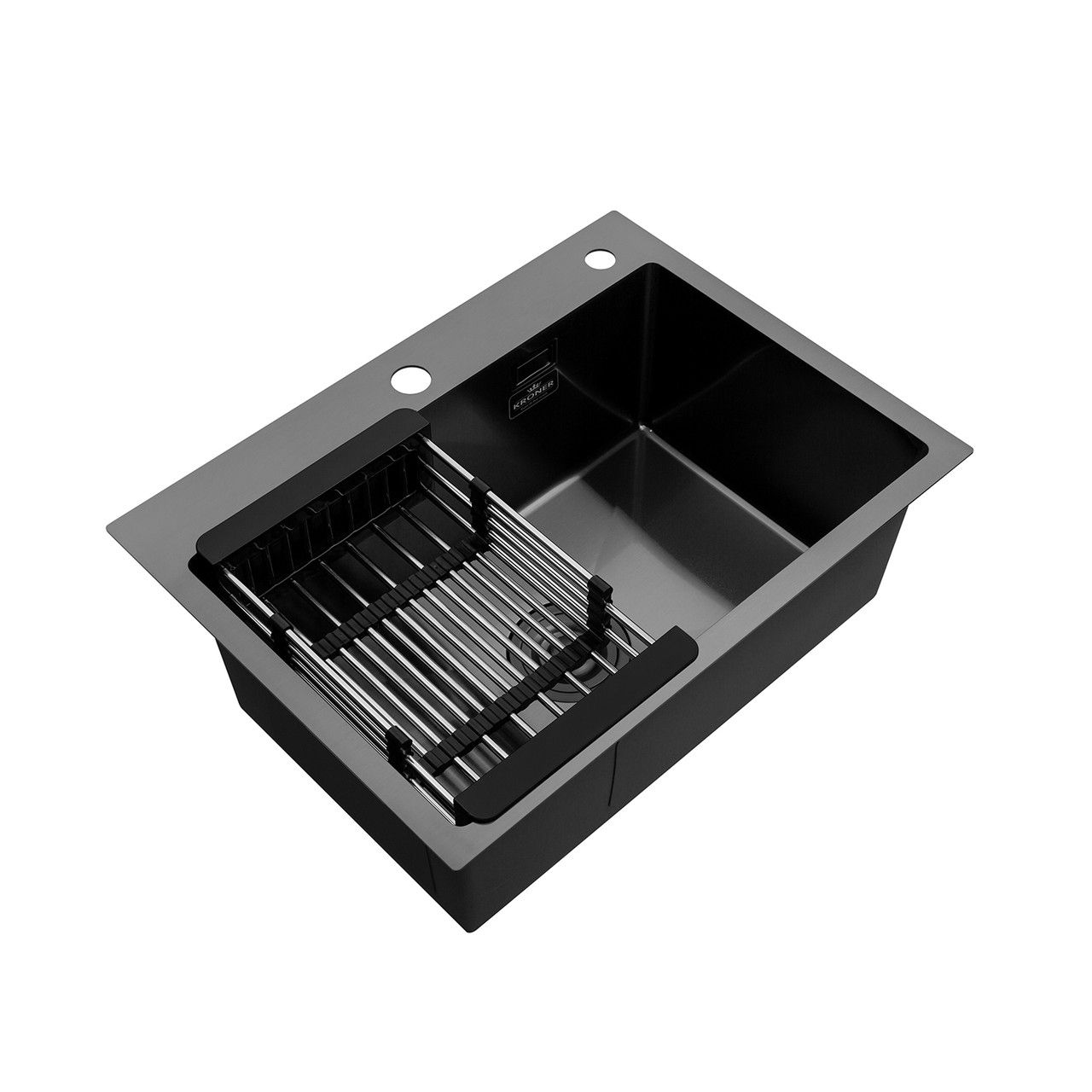 Кухонна мийка Kroner KRP Schwarze — 5843HM PVD (3/1 мм) — ідеальне рішення для сучасної кухні. Завдяки своїй прямокутній формі та стильному дизайну вона впишеться в будь-який інтер'єр. Інтегрований спосіб монтажу дає змогу без проблем встановити мийку. Виготовлений із високоякісної неіржавкої сталі. Практичне доповнення — вбудований отвір для дозатора мийного засобу. Функціональна, надійна й естетично приваблива мийка від Kroner стане незамінним помічником у приготуваннях і прикрасою вашої кухні.