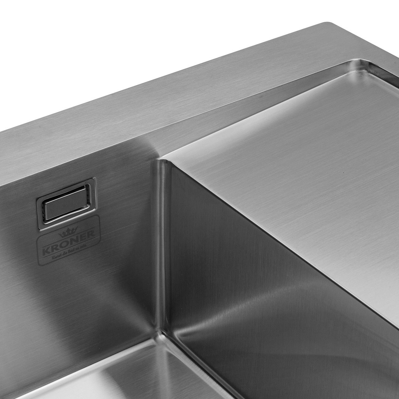 Кухонна мийка Kroner KRP Gebürstet — 6350LHM (3/1 мм) виготовлена з високоякісної неіржавкої сталі харчової марки, що дасть змогу виробу слугувати довгі роки. Чудова якість і дизайн мийки дадуть змогу задовольнити найвищі вимоги та створити затишок у вашому домі! Випуск сифона виготовлений із неіржавкої сталі зі сміттєзбірником у формі відерця та закривається корком-кришкою, яку можна використовувати за потреби набрати води в чашу. Мийка обладнана переливом для відведення води в екстрених випадках. Інтегрований спосіб монтажу дає змогу встановлювати мийку в будь-якому можливому варіанті, класичному врізному — над стільницею, інтегрованому — мийка встановлюється в рівень зі стільницею, і монтаж під стільницею.