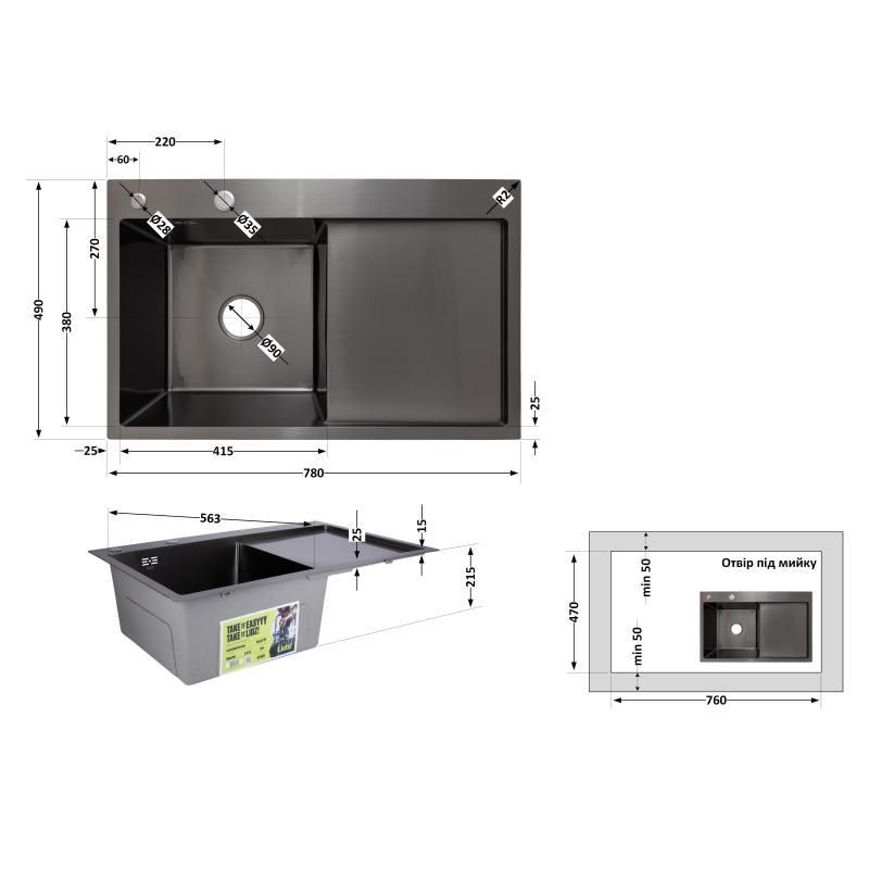 Мийка для кухні інтегрована Lidz Handmade H7849BR крило праворуч (LIDZH7849BRPVD3008) Brushed Black PVD