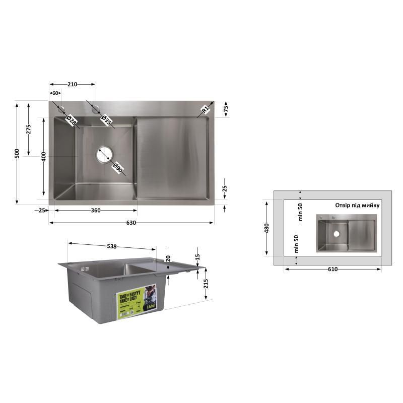 Мийка для кухні інтегрована Handmade H6350R крило праворуч (LDH6350BRUR45587) Brushed Steel 3,0/1,0 мм Lidz