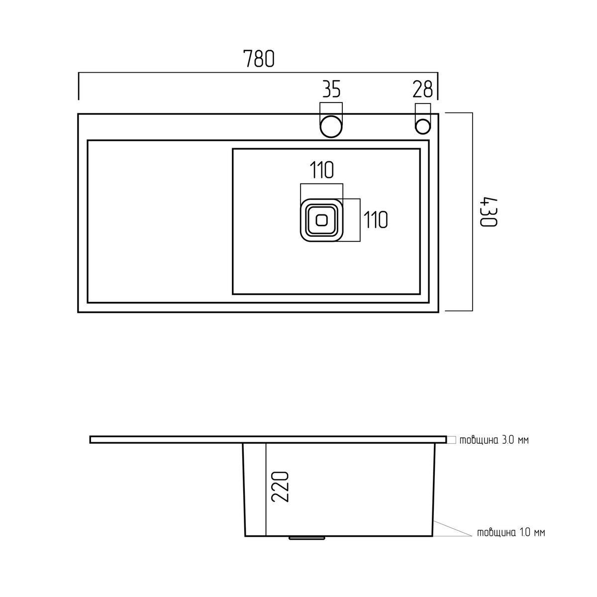 Її ширина становить 780 мм, довжина — 430 мм, а глибина — 220 мм. Такі розміри роблять її зручною для використання й забезпечують достатній простір для миття посуду та продуктів.