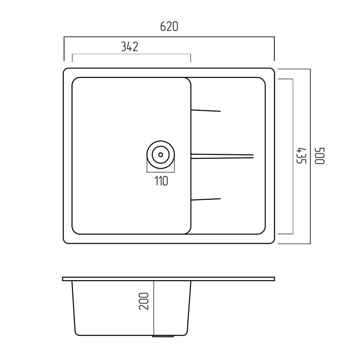 Завдяки своїм компактним розмірам — довжина 620 мм і ширина 500 мм, глибина 200 мм — ця мийка ідеально підходить для невеликих кухонь, де кожен дюйм просто цінний. Квадратна форма надає сучасності та гармонії в дизайні. Розмір чаші 342x435x200мм.