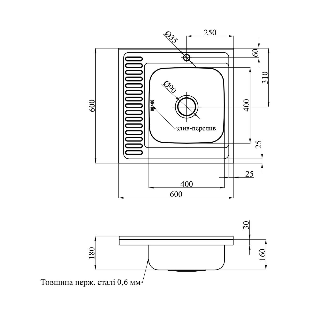 Кухонна мийка накладна Kroner KRP Satin — 6060R (0.6 мм)