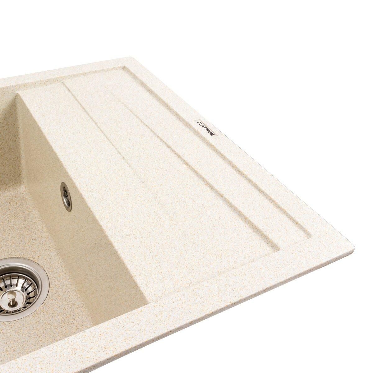 Гранітна мийка для кухні 7050 CASCADA кольору Пісок українського бренда Platinum — це стильна, врізна прямокутна мийка, яка своїм виглядом прекрасно доповнить дизайн вашої кухні. Мийка на 80% складається з кварцу та на 20% з дуже жорсткої акрилової смоли, завдяки чому невибаглива в догляді, а також має великий запас міцності.