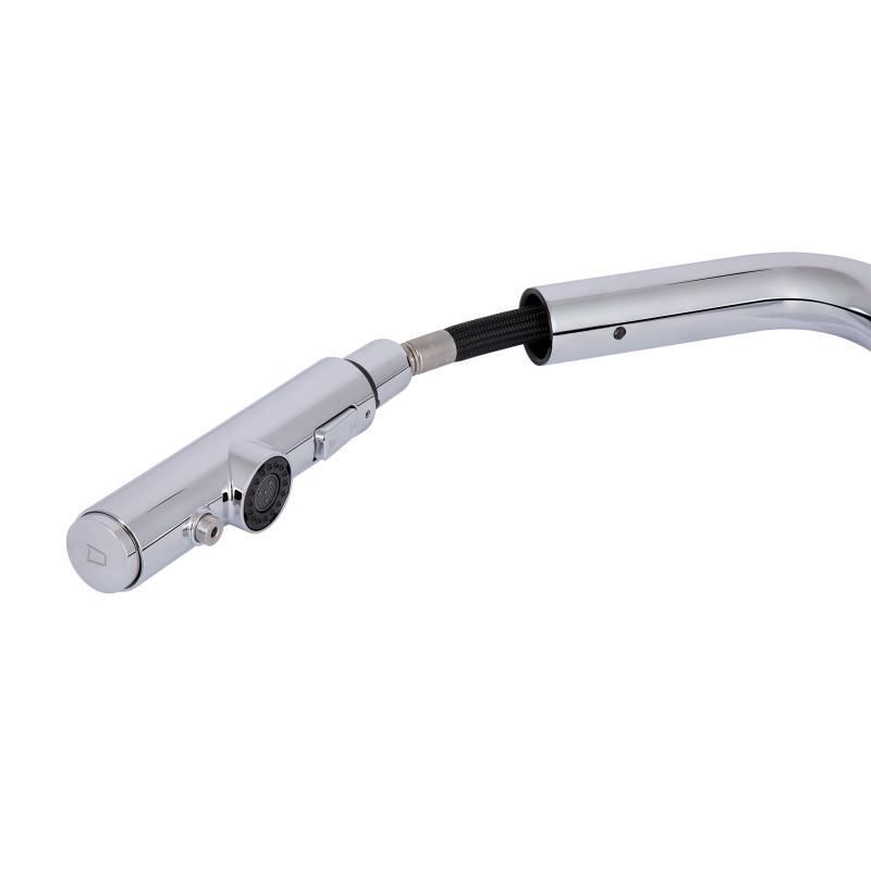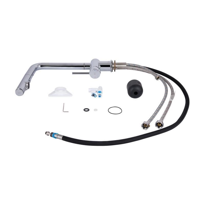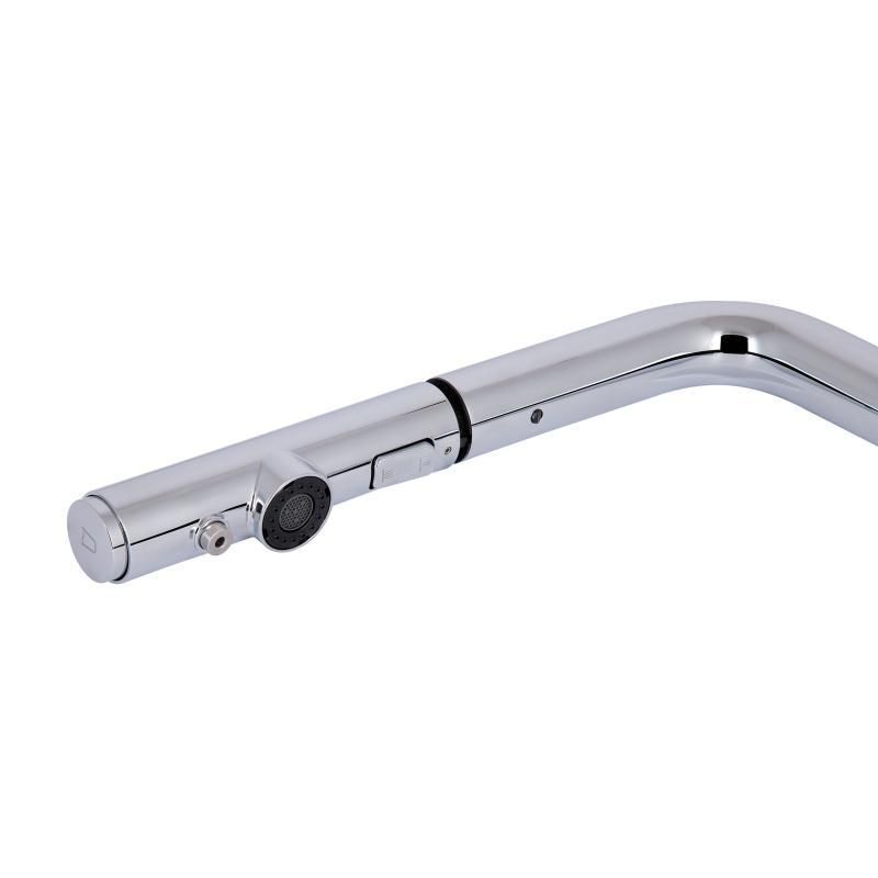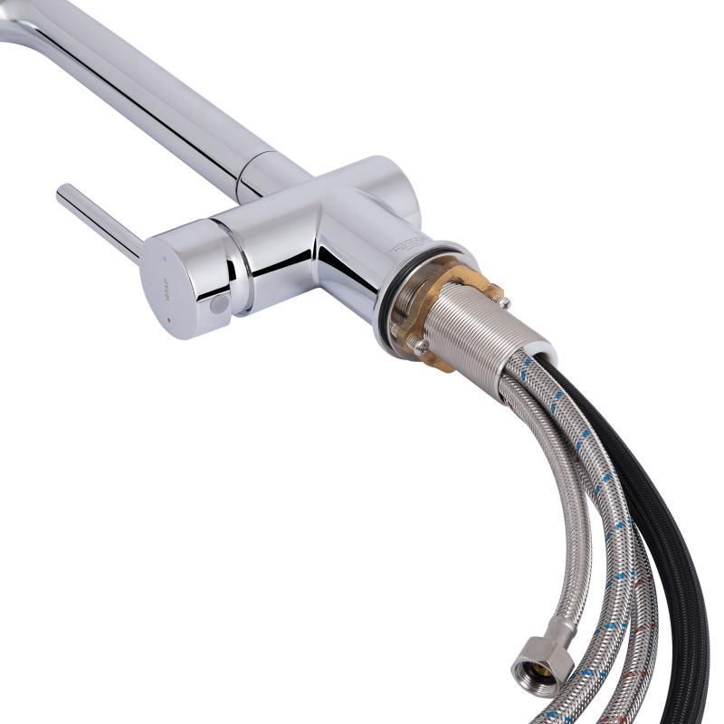 Змішувач для кухні Qtap Rozcesti QTROZ367CRM45941 у хромованому виготовленні поєднує в собі елегантний дизайн і високу практичність. Висувний вилив полегшує процес миття посуду та наповнення великих ємностей, а під'єднання для питної води забезпечує доступ до чистої води без потреби встановлення додаткового крана. Хромоване покриття захищає змішувач від корозії та пошкоджень, забезпечуючи його довговічність і привабливий зовнішній вигляд.