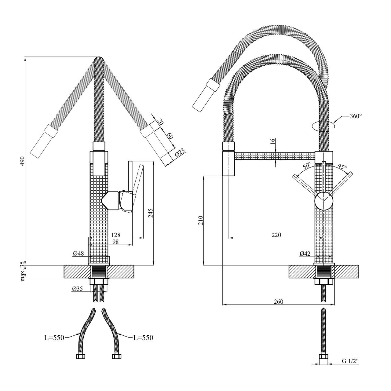 Монтаж змішувача здійснюється врізним способом, що надає кухонній мийці стильний і сучасний вигляд. До комплекту входять шланги для під'єднання діаметром 1/2", що неабияк спрощує процес встановлення.