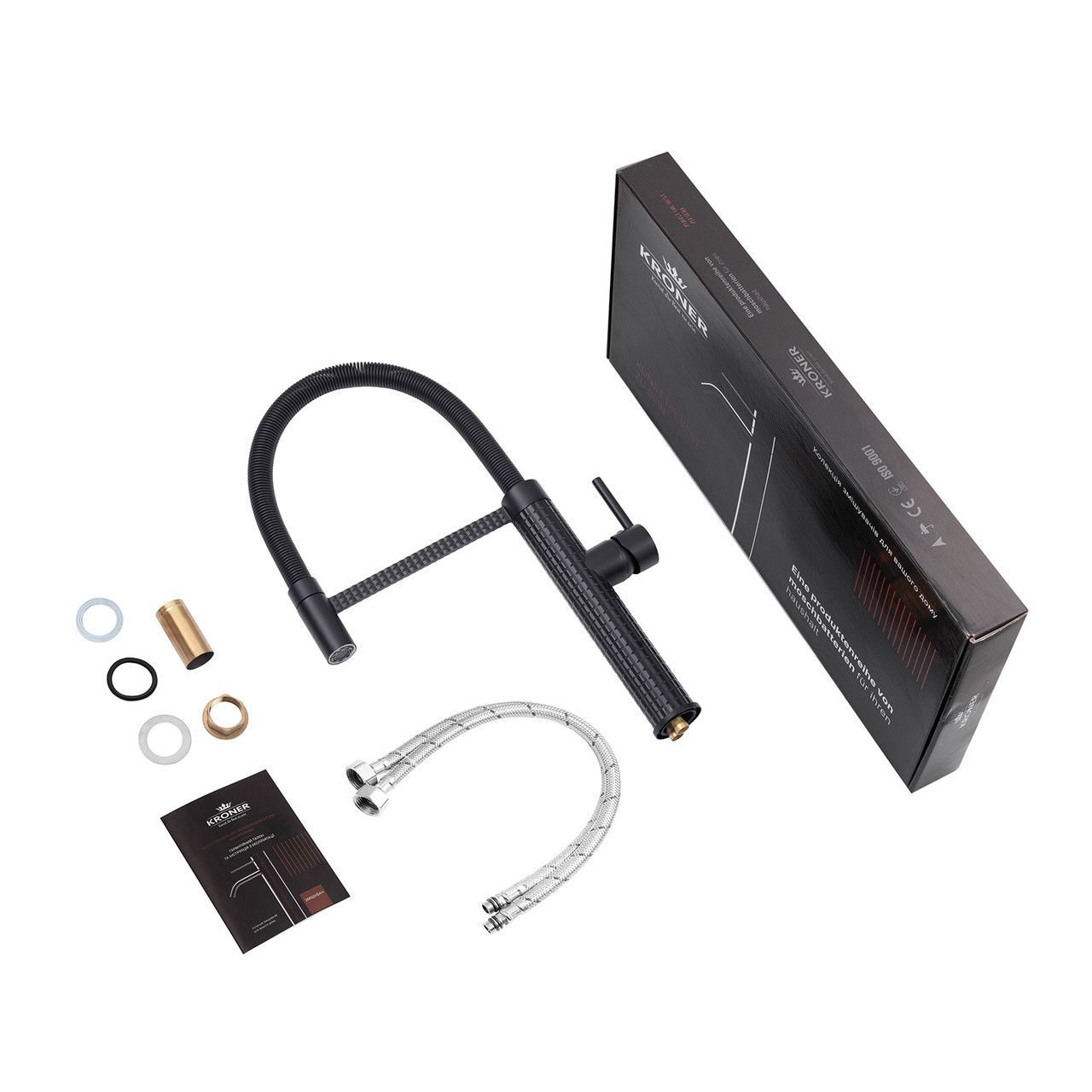 Kroner KRP Ersel — SCH03999 поєднує в собі елегантний матовий корпус чорного кольору з функціональним чорним гнучким виливом та універсальним аератором, що робить його ідеальним вибором для будь-якої сучасної кухні.