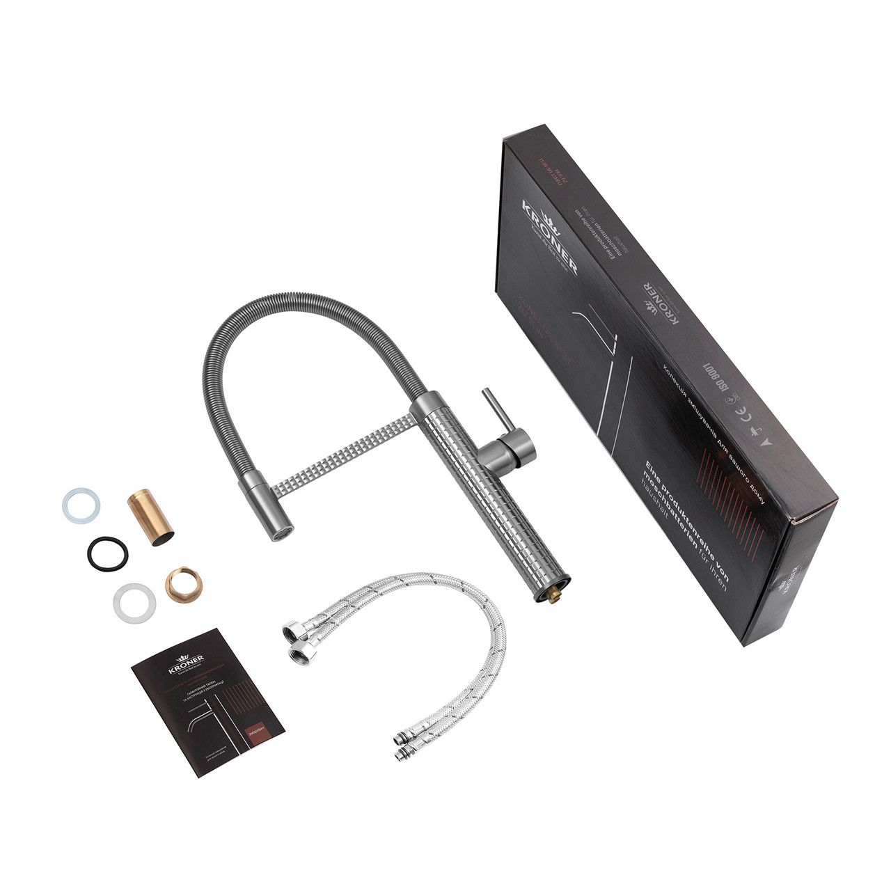 Kroner KRP Ersel — GRP03999 поєднує в собі елегантний брашований корпус графітового кольору з функціональним чорним гнучким виливом і універсальним аератором, що робить його ідеальним вибором для будь-якої сучасної кухні.